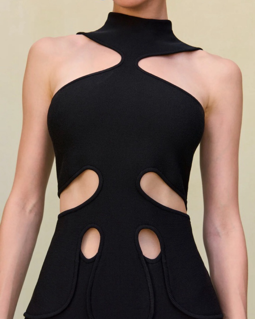 This sleek black dress features a bold cutout design, perfect for making a statement at any formal or cocktail event. Staud Lillie knit dress. Heavy knit fabric. SOLD OUT.