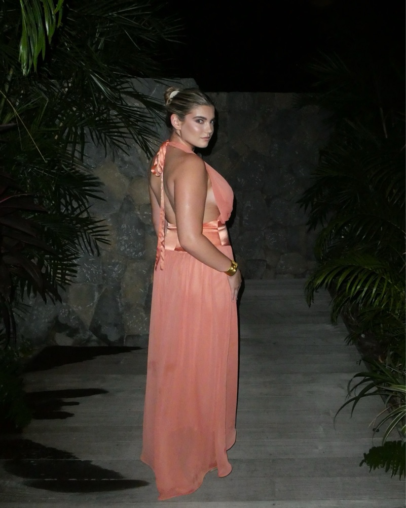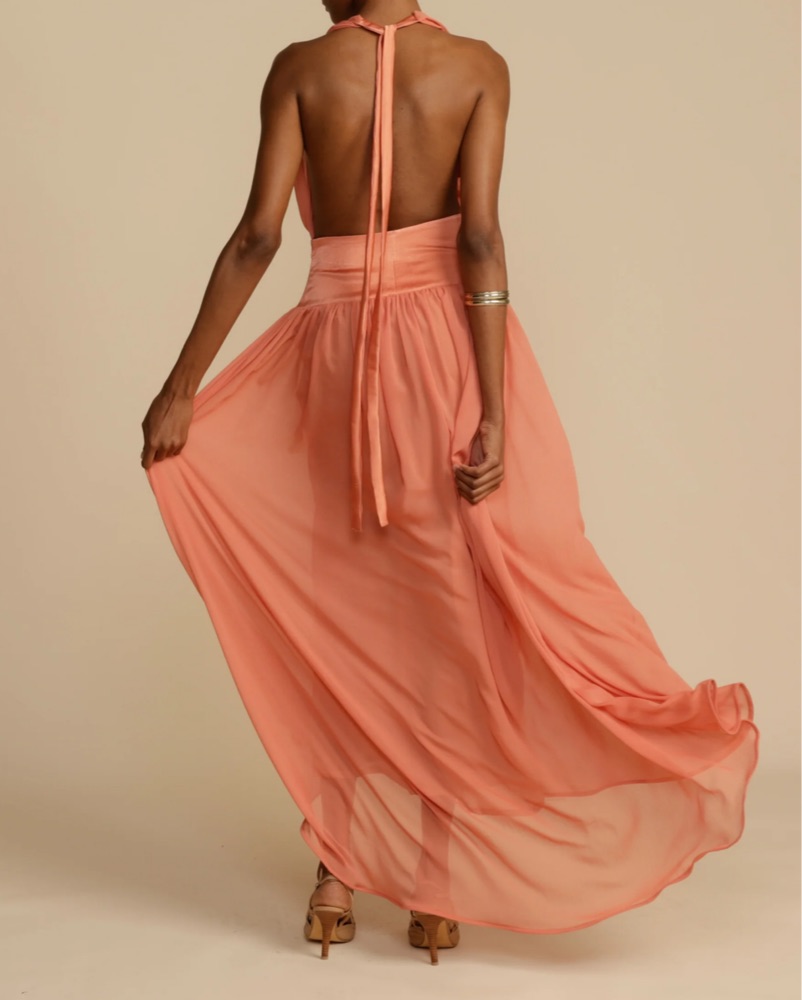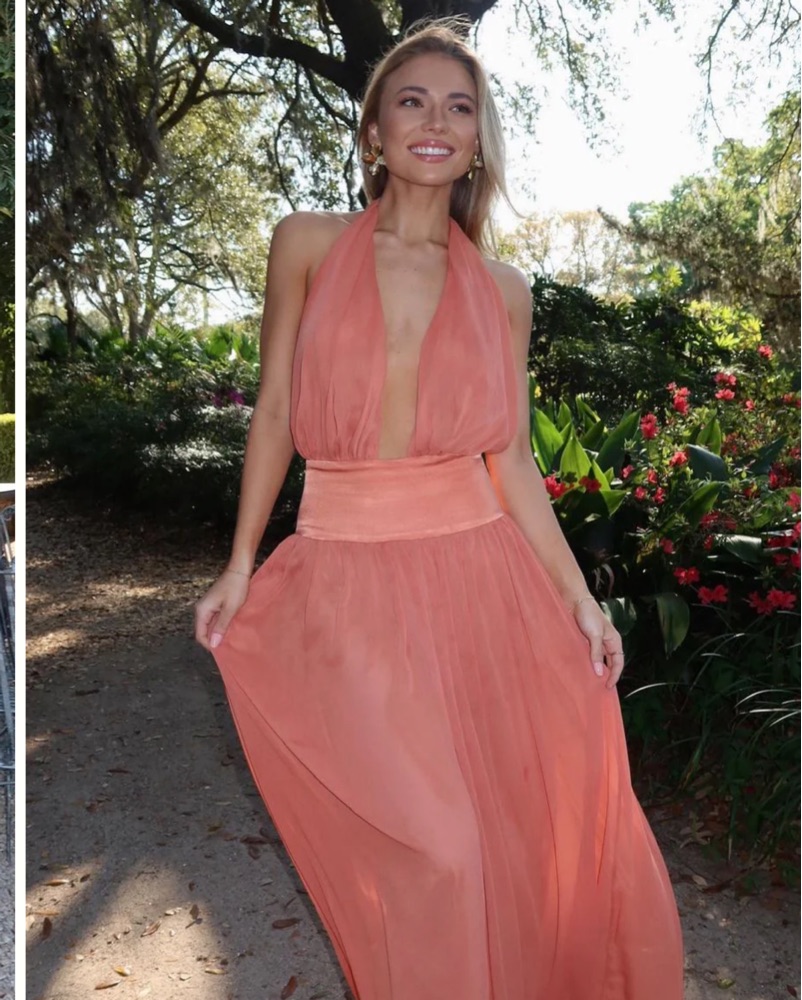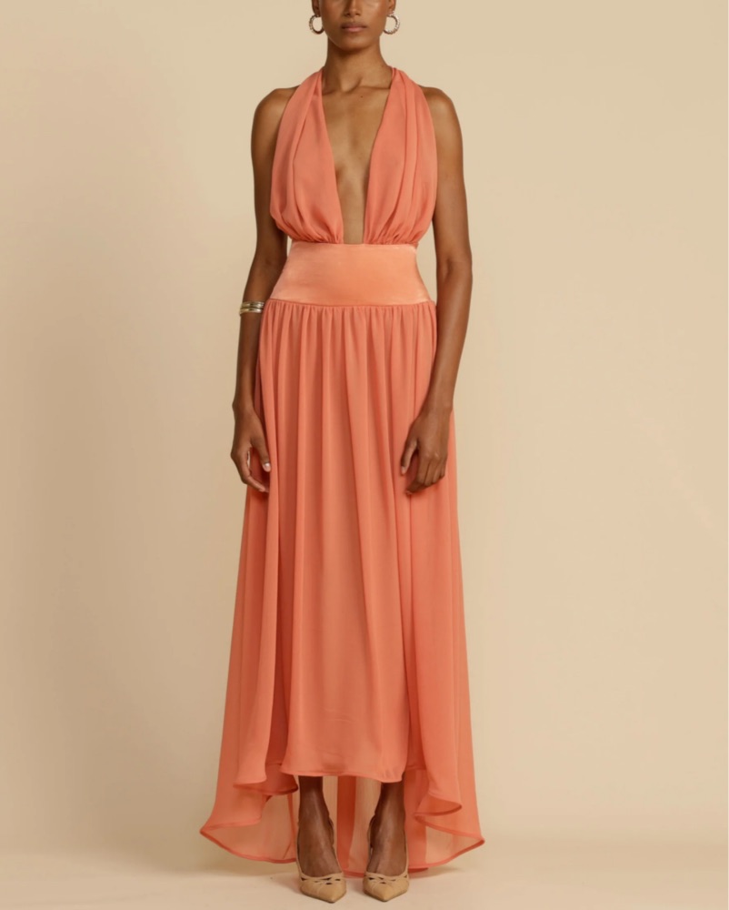 This stunning coral halter maxi dress is perfect for a formal occasion or a summer wedding. The flowing, high-low silhouette and deep-V neckline create a flattering, elegant look.