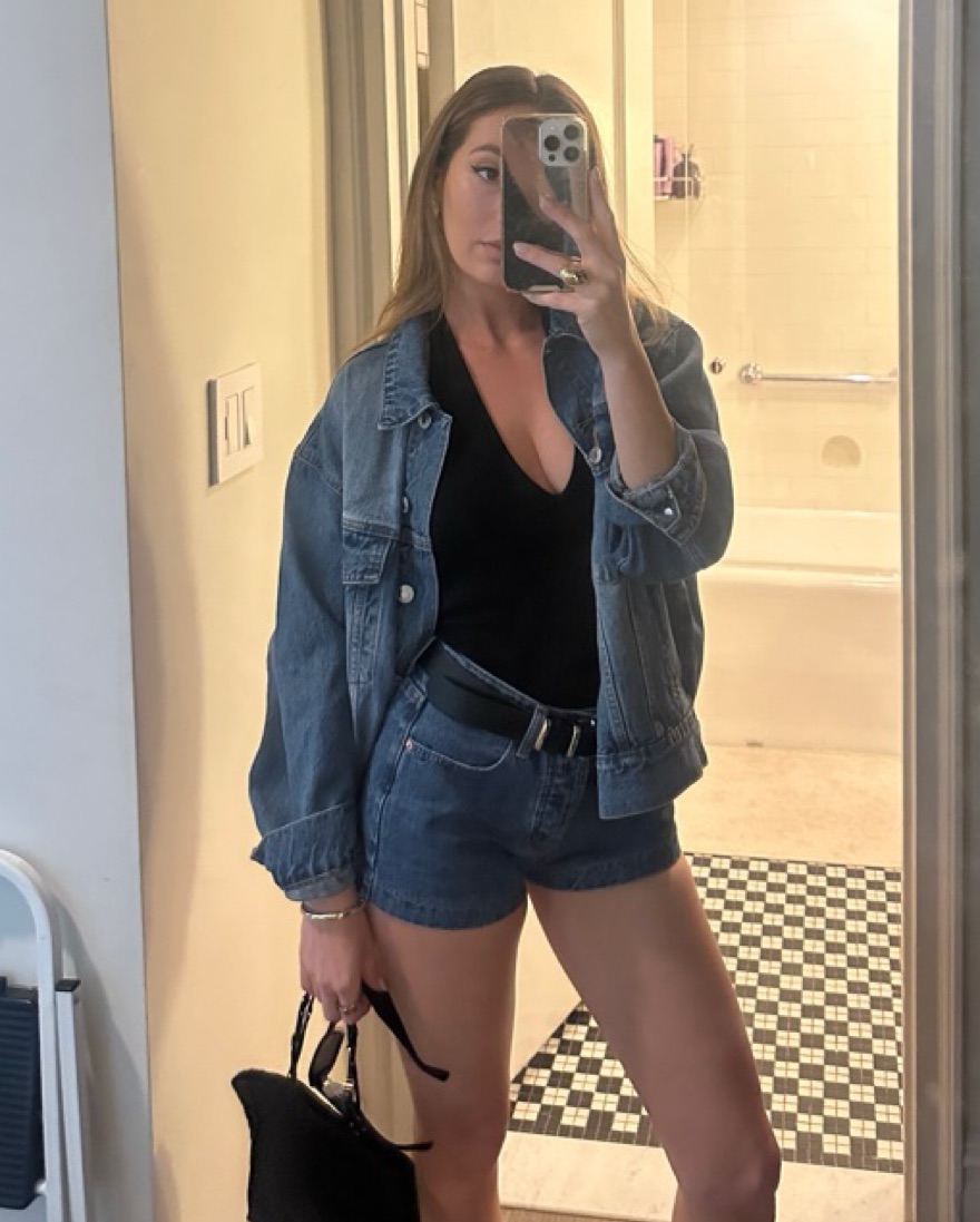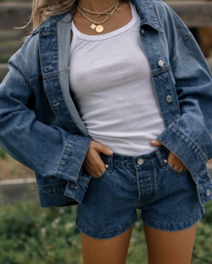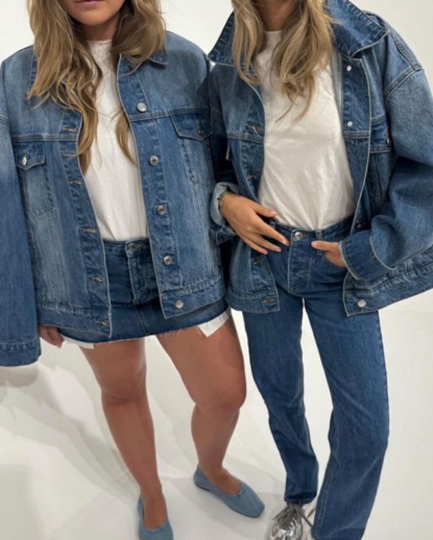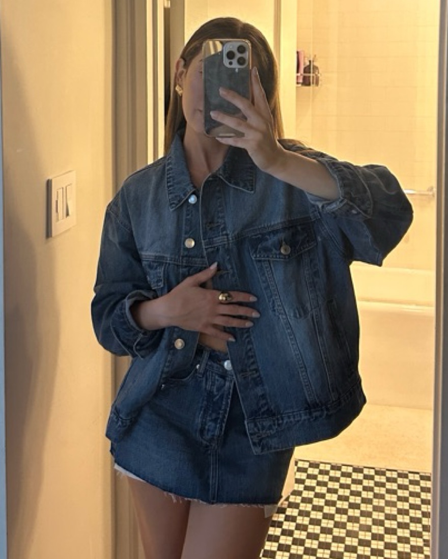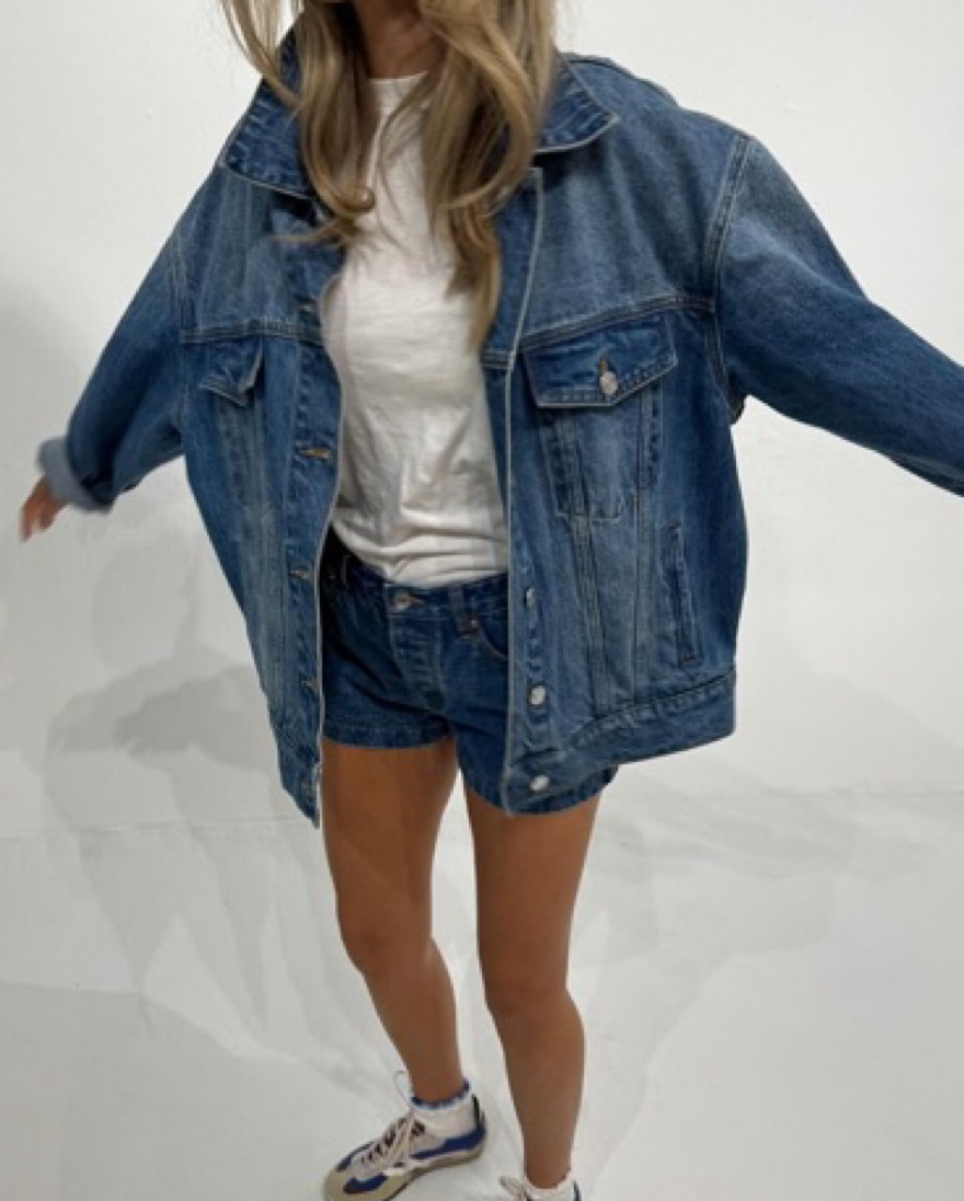 Parke oversized denim jacket in medium wash. XS but the oversized fit makes this fit closer to a regular relaxed M. So cute alone over a sundress or paired with the matching mini skirt or shorts (also listed)