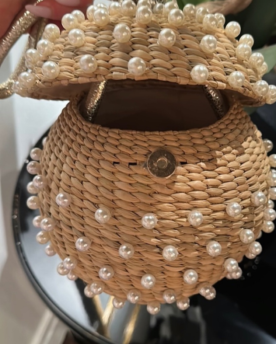 Brand new - perfect condition.. never been worn! Pearl embellished embellished rattan disco bal bag w/ metallic wrist handle by Poolside. Disco ball wristlet;Wristlet, 9" drop