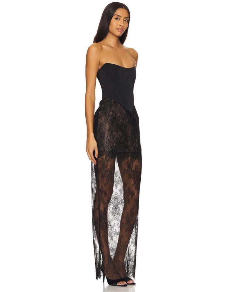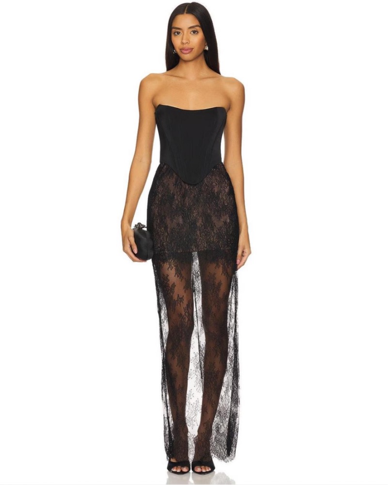 black strapless lace maxi gown from revolve. size small; runs slightly big. better suited for a larger chest and 5.5” or taller. only worn once to a wedding—absolutely stunning. material is very delicate so please take care of it! dry clean only.