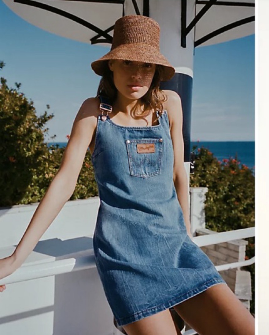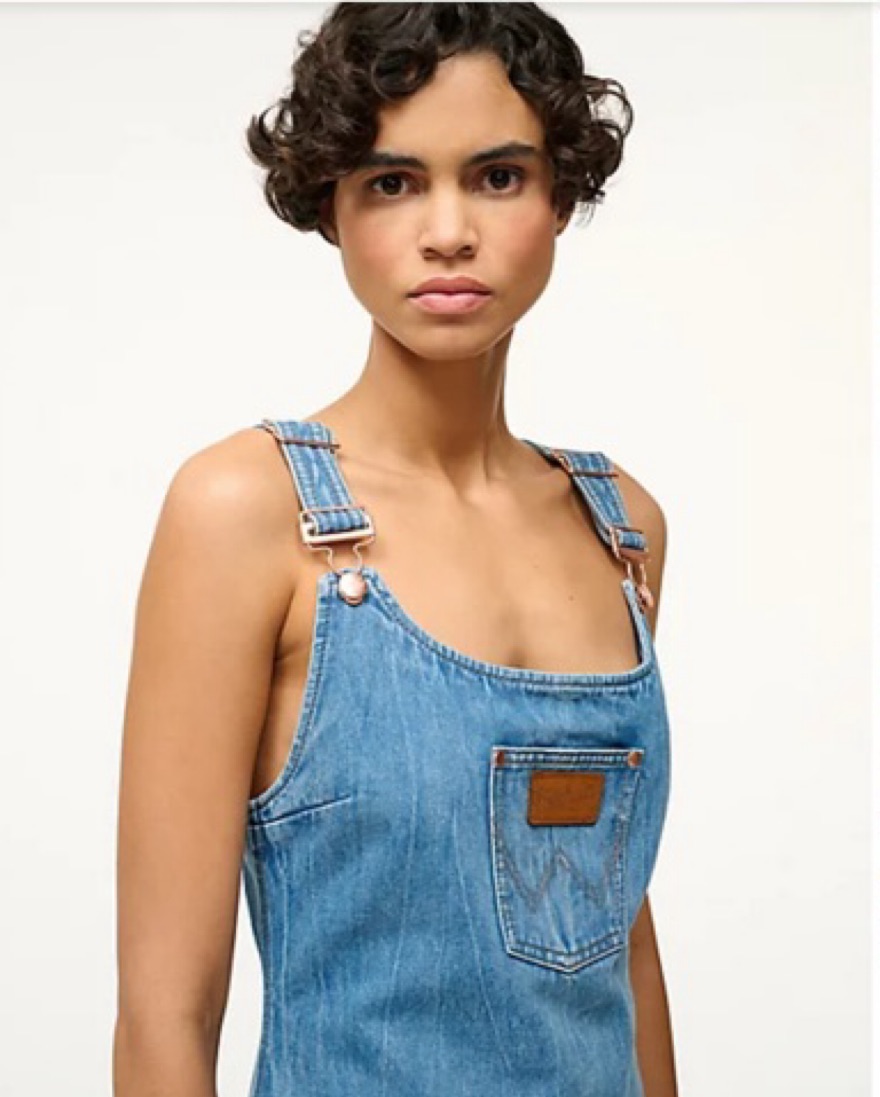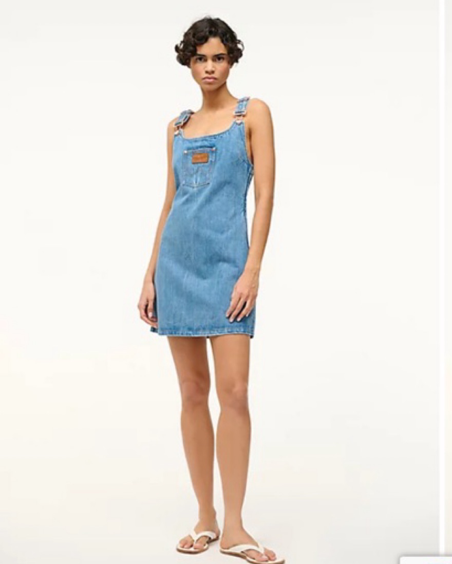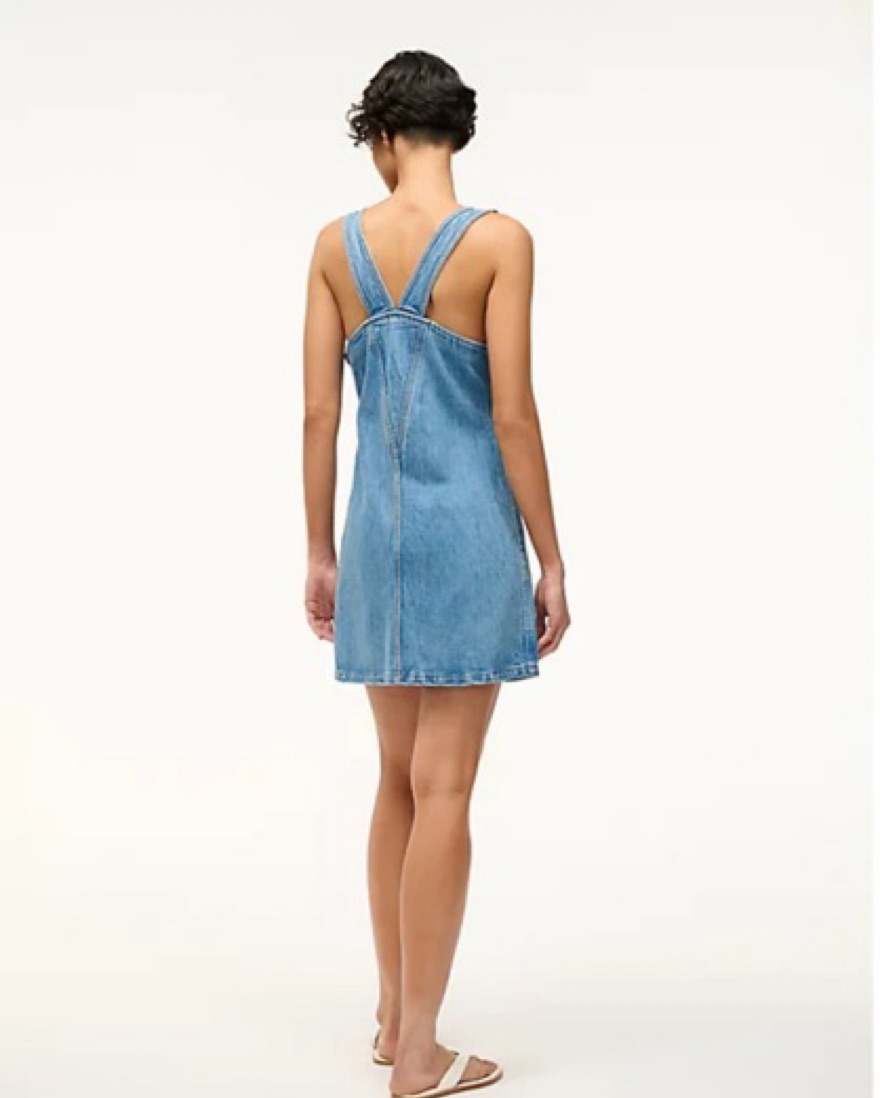 The Overall Mini Dress is a mini length dress crafted in comfortable denim chambray. This style has a side zip, a front pocket, and features adjustable overall-style straps.