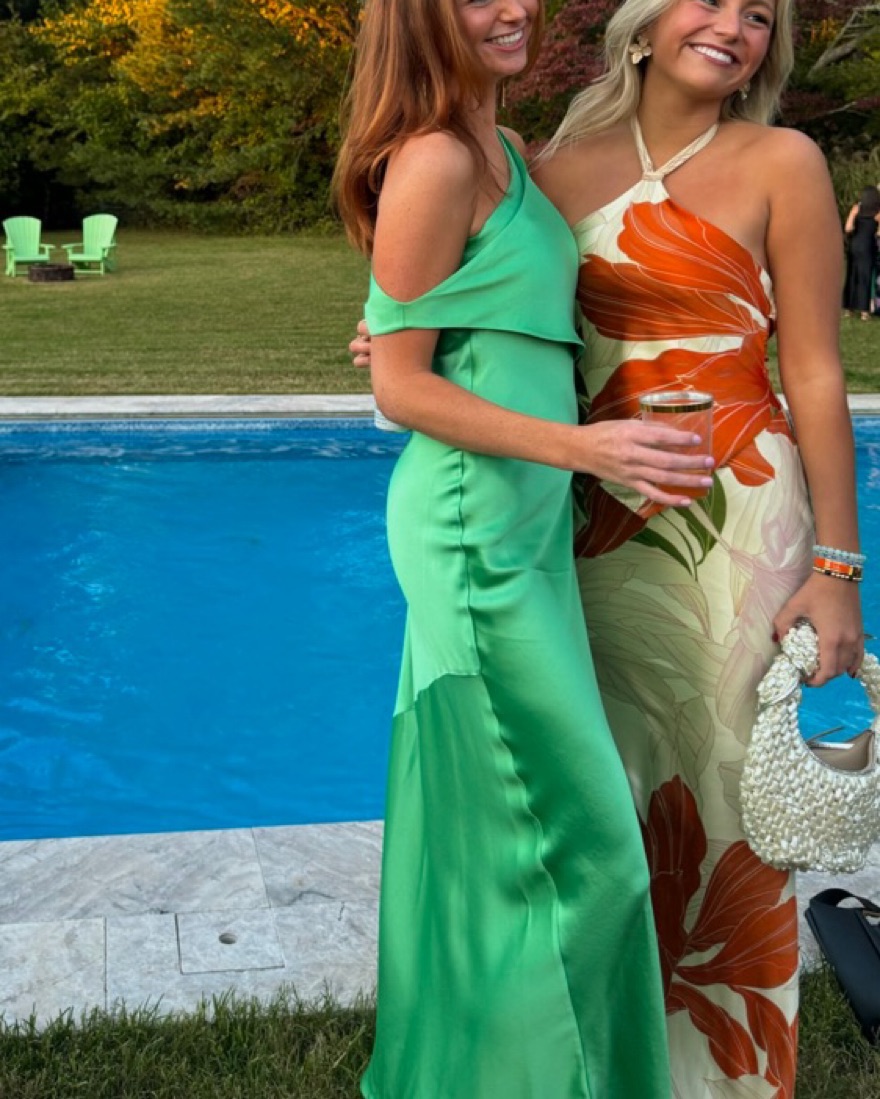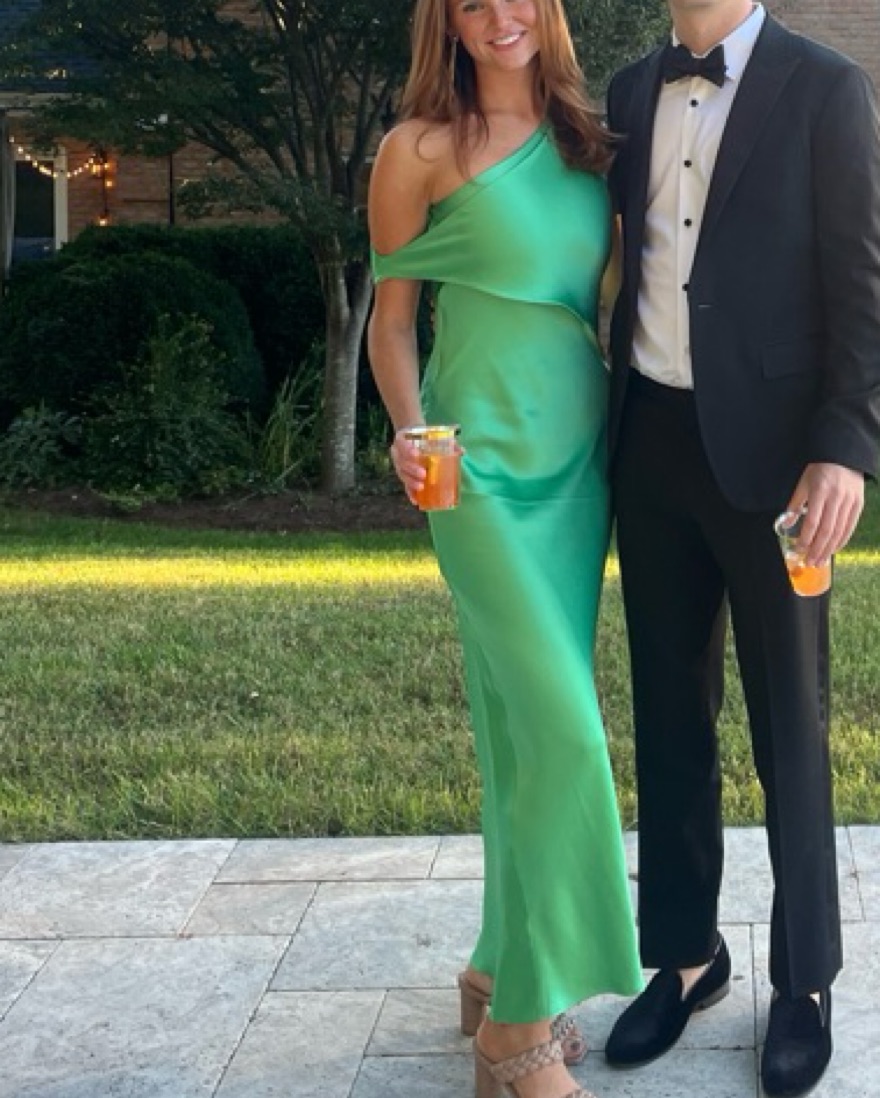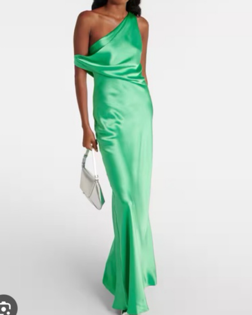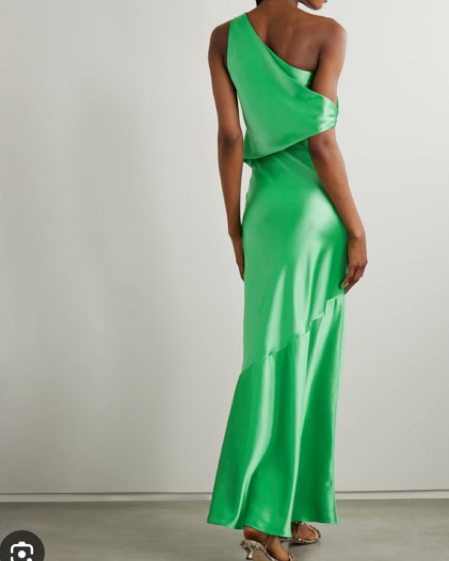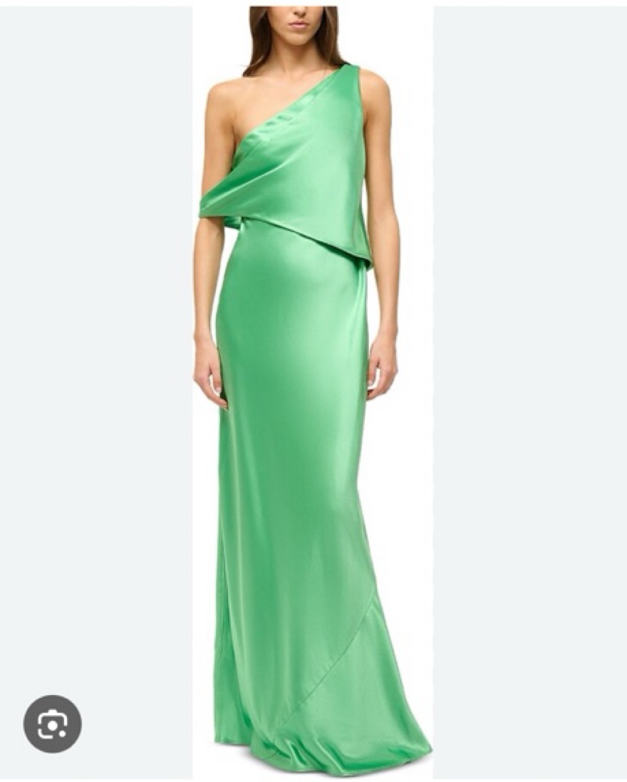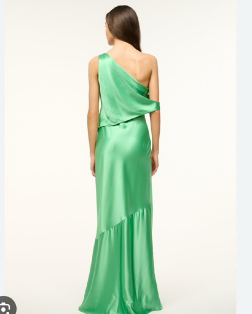 Gorgeous one shoulder silk gown in seaweed green. Super flattering and perfect length for a formal or wedding.