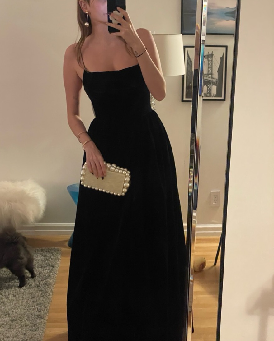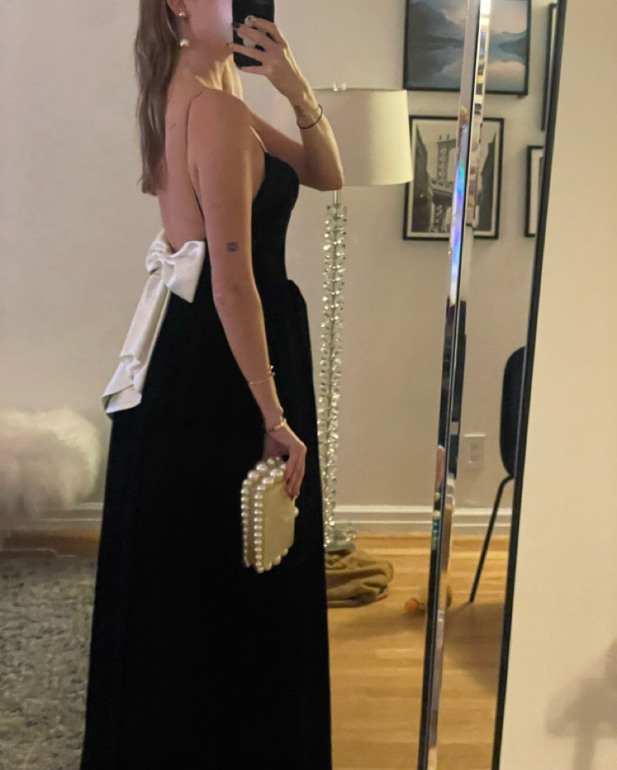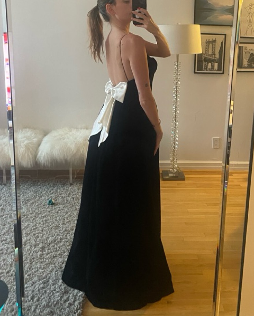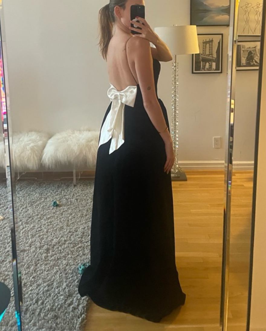 Black velvet nana Jacqueline Candace dress with white satin bow back. Perfect for black tie events