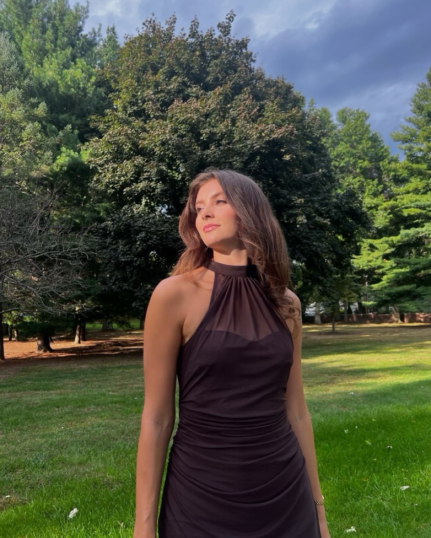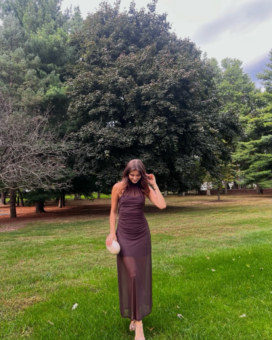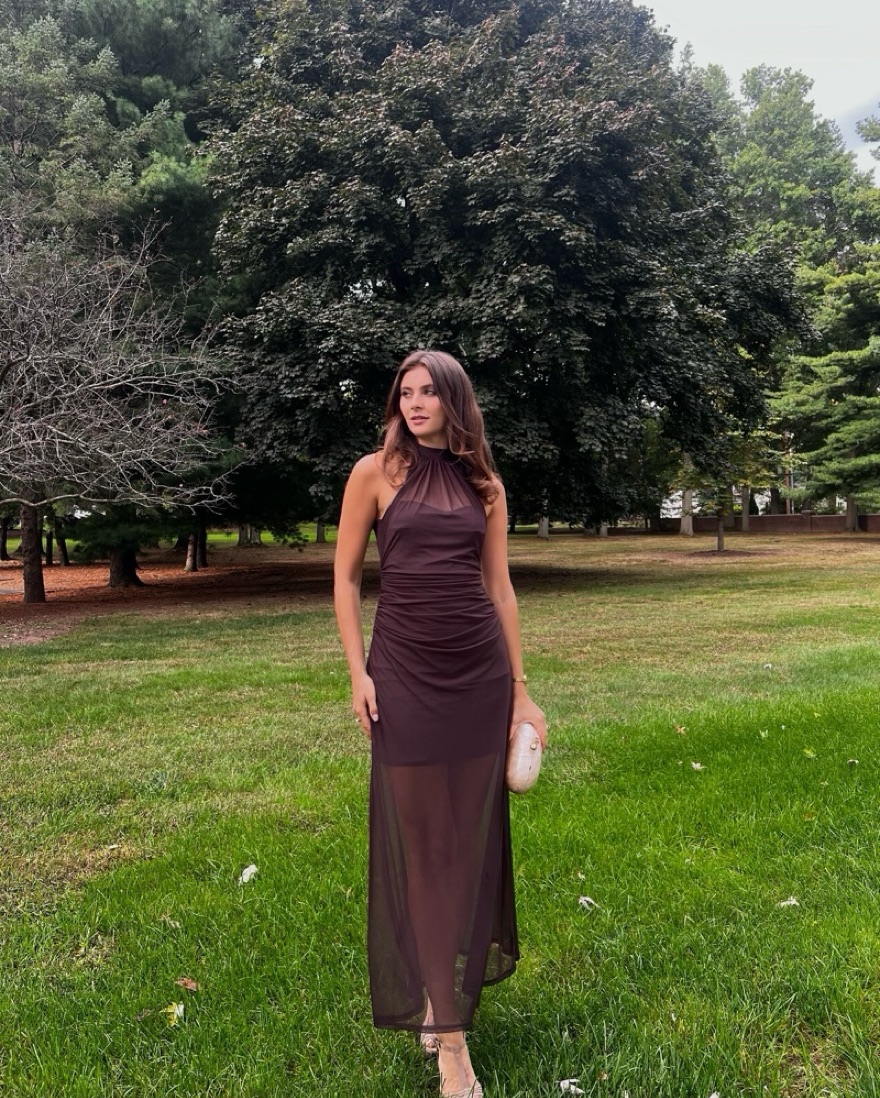 Sheer halter open back maxi dress brown perfect for fall wedding guest dress. Worn once perfect condition super stretchy and comfortable