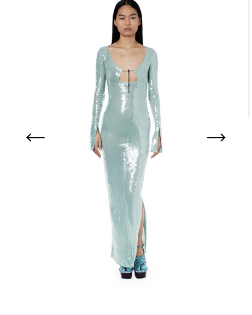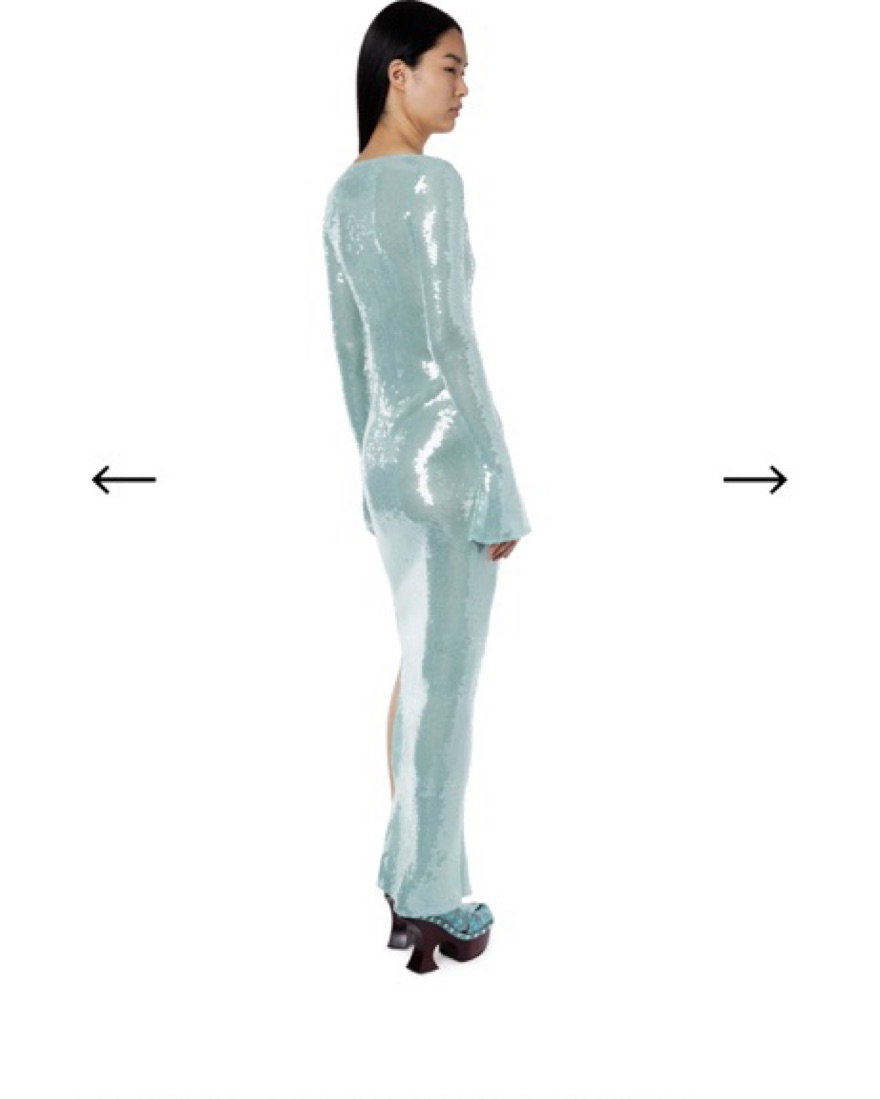 Fits like US 4 - THE SOLARIA MIDI DRESS IN ICE SEQUIN FEATURES A KEYHOLE CUTOUT NECKLINE WITH A DRAWSTRING CLOSURE. CUT IN A SLIM FIT WITH A SLIGHT STRETCH, IT IS DESIGNED TO BE PULLED ON OVER THE HEAD.