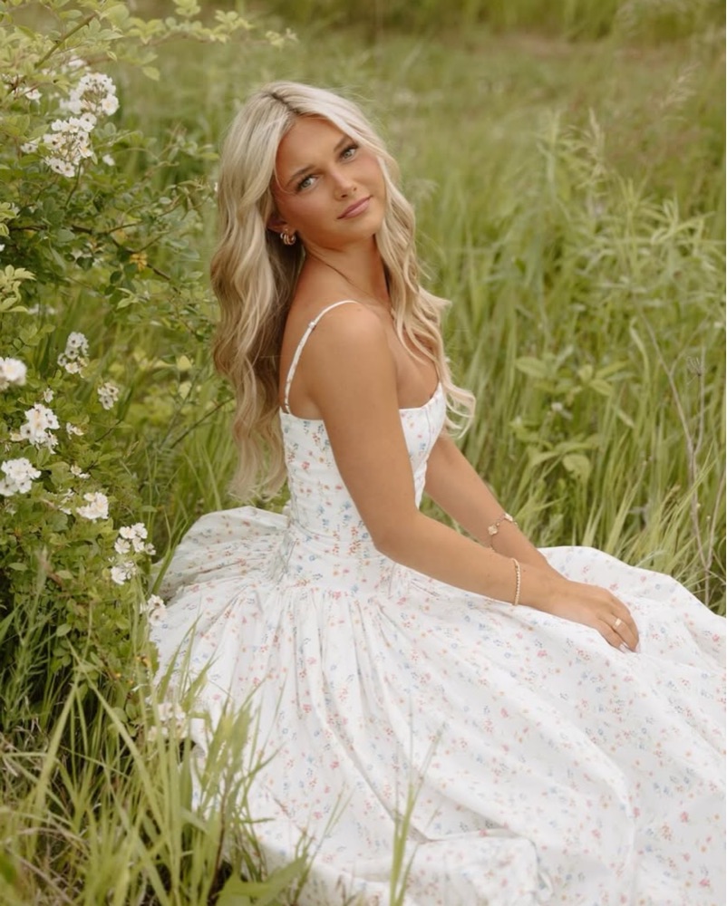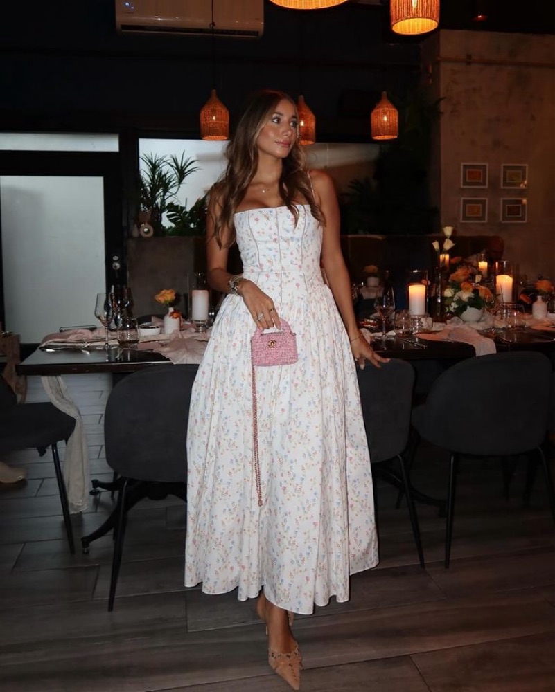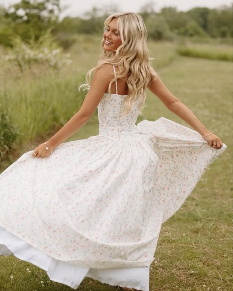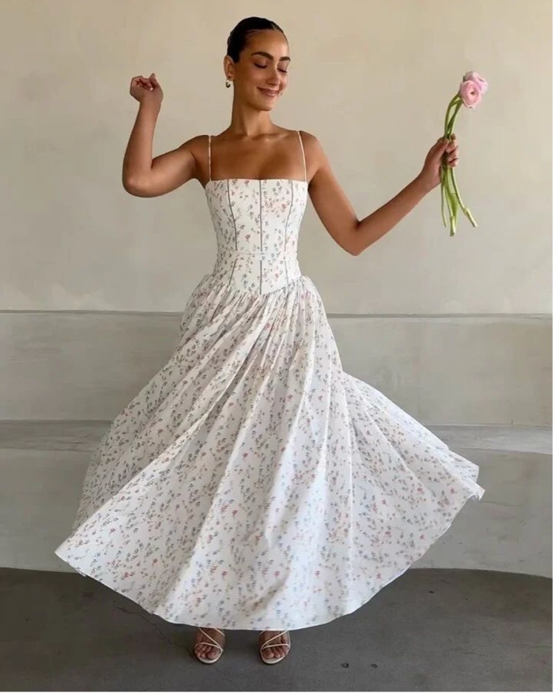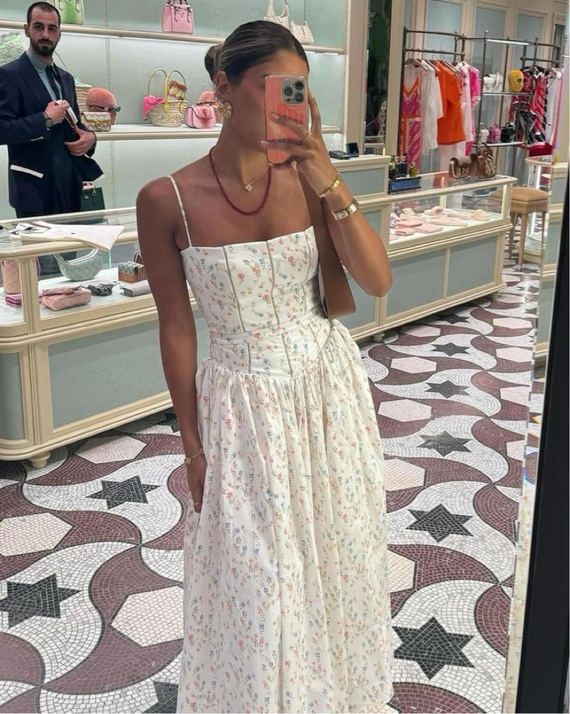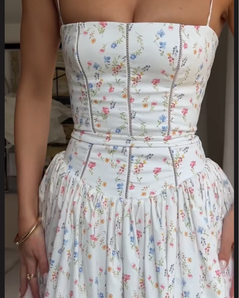 Print Cotton Maxi Sundress. Size M but fits like a size small/4. I’m a size 4/26/32C and it fits perfect! Great for showers or bridal looks. Fits smaller cup sizes like A-C