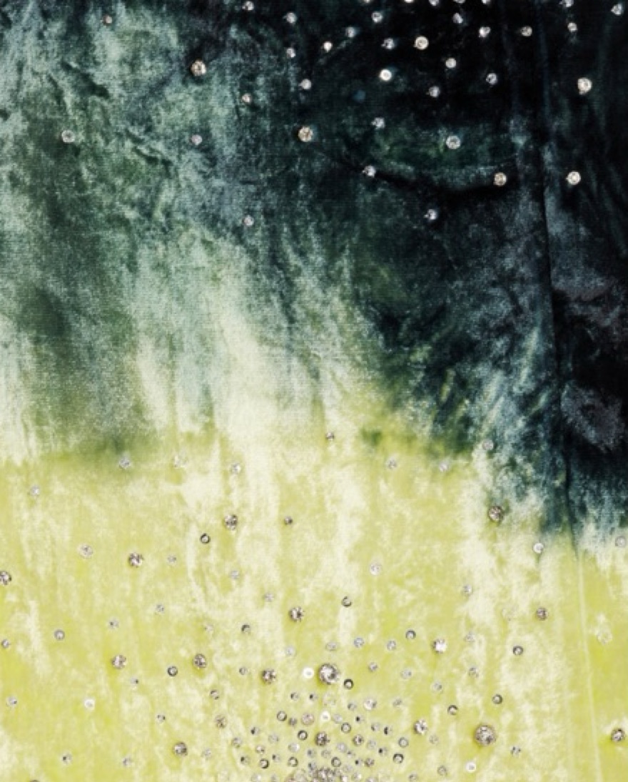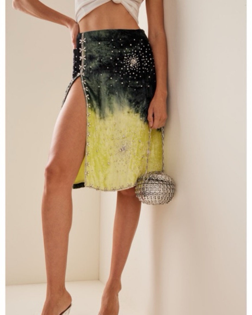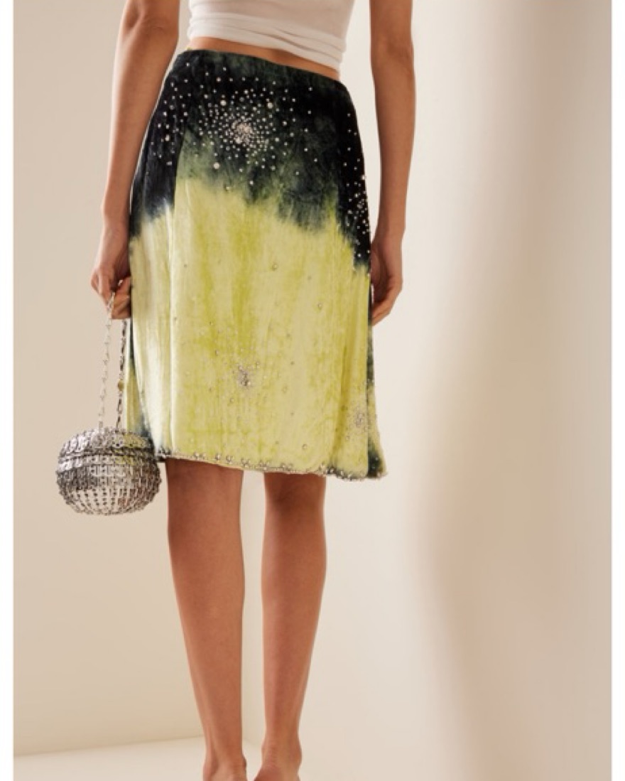 Des_phemmes Crystal Embellished Velvet Midi skirt. Black/lime. Made in italy