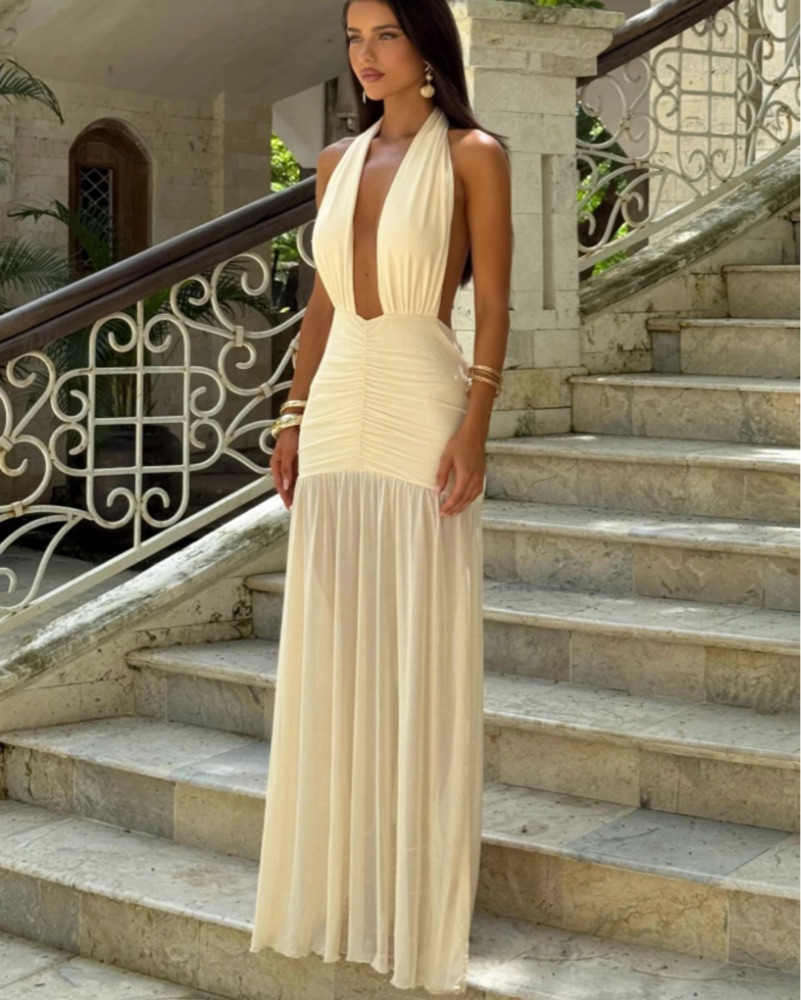 Crafted from soft, gathered mesh, the Rosii Maxi Dress features a deep plunge halter neckline, a fitted ruched skirt that enhances your shape, and an open back with adjustable ties for a custom fit. Fully lined through the bust and up