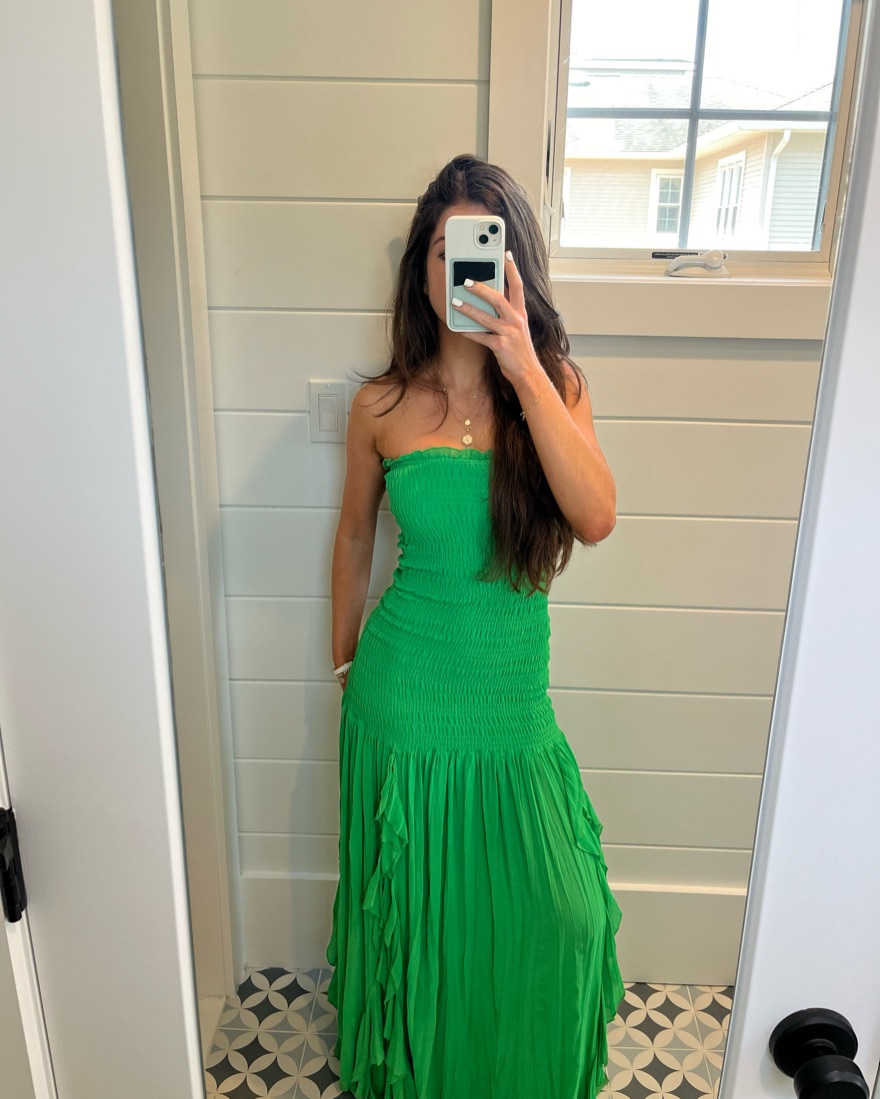Strapless maxi dress w/ ruffled skirt and smocked bodice. Sold out online. Perfect condition. So flattering for wedding guest or vacation!