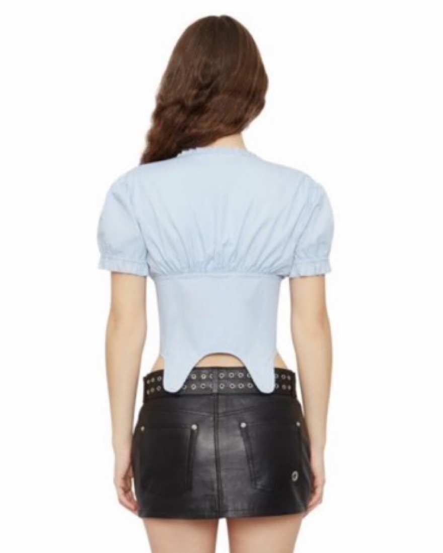 elasticated puff sleeves, hook & eye closures at center front, functional tie at center front, boning at waist, and angled hem.
