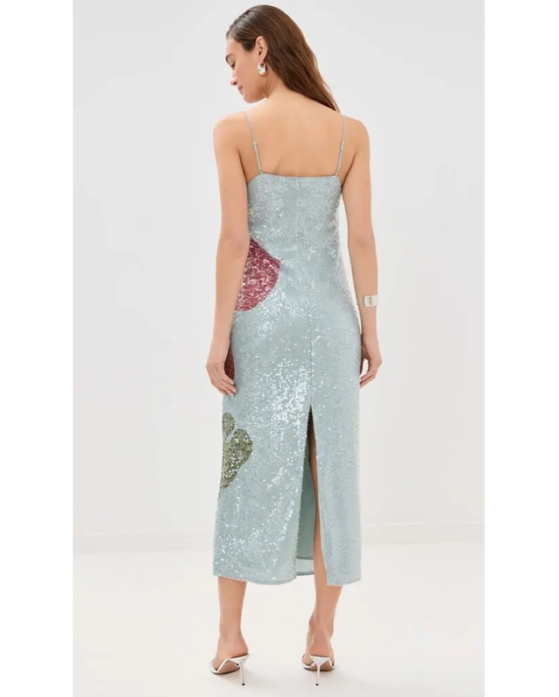 This shimmering midi dress is perfect for a night out dancing or a special occasion. The intricate floral sequin pattern and slit design add an elegant and feminine touch.