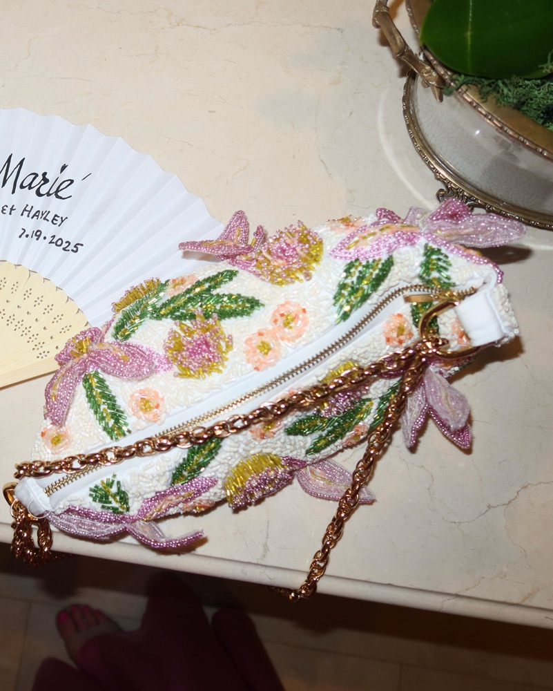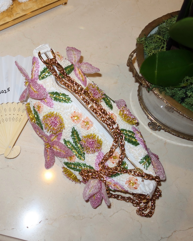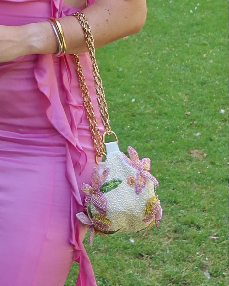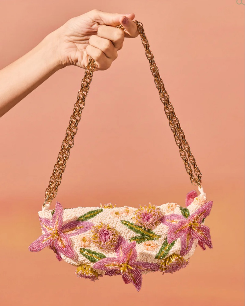 BRUMA COTTON POPLIN BAG EMBROIDERED FLOWERS. Delicate beaded flowers, bag isn’t meant to be throw around as the flowers stick and bend off of the bag. Perfect for a summer wedding. Bag must be stuffed to hold its shape. Can be worn as shoulder bag or longer by adjusting the chain, best as clutch