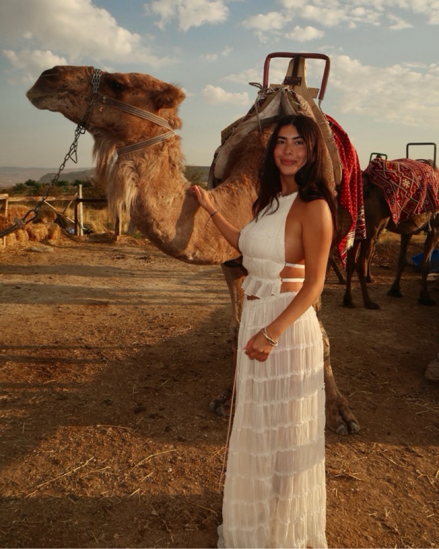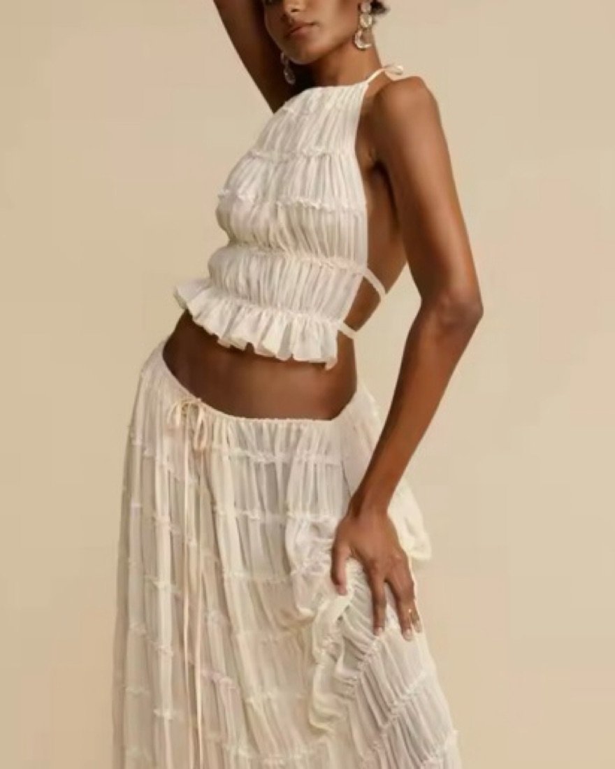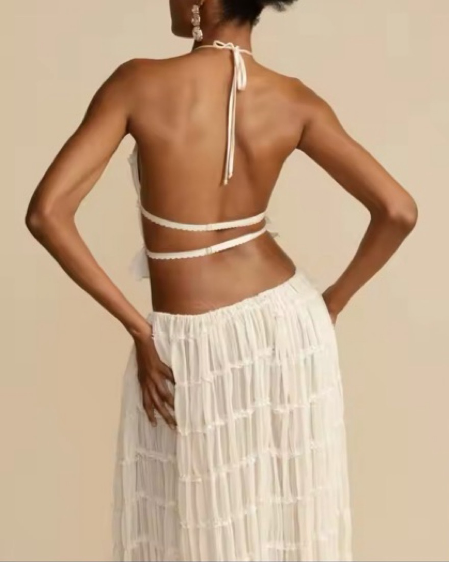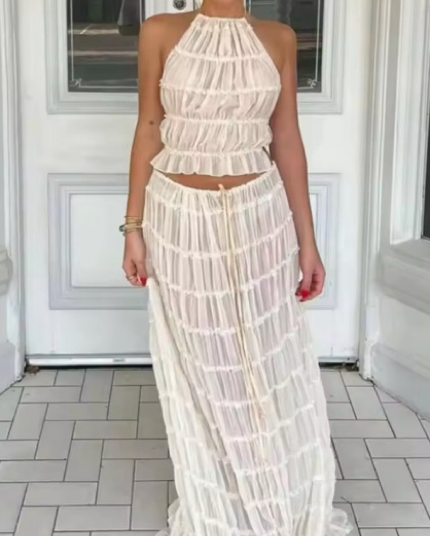 Halter top and skirt set, skirt is semi transparent (top around chest area is solid color). More of a cream-white color. super cute boho dupe | key words: maxi skirt top cover up vacation matching set