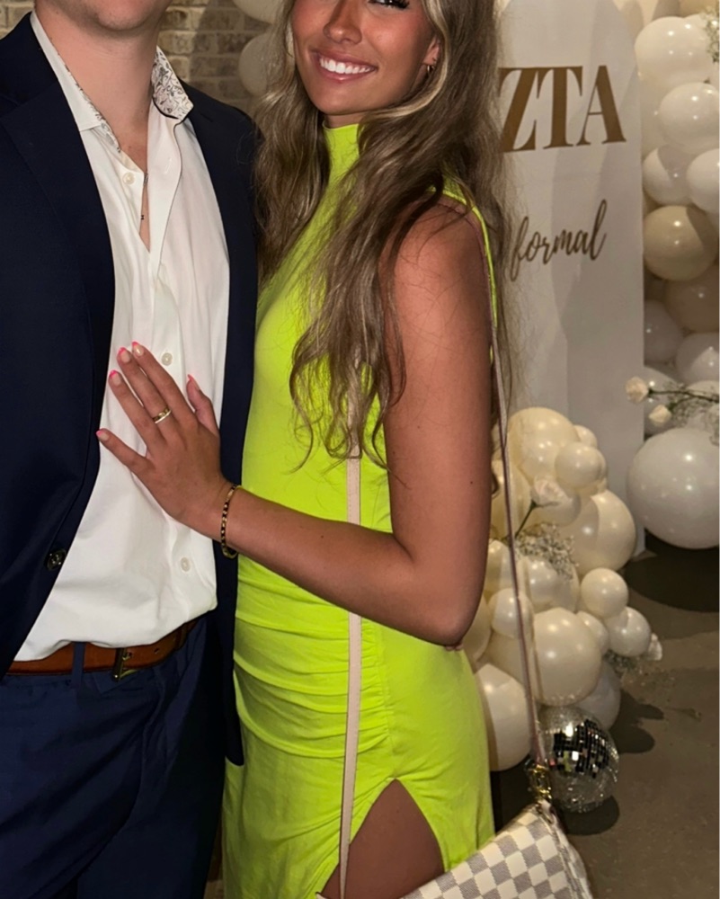 This eye-catching neon green dress is perfect for a night out or special event. The ruched details and thigh-high slit add a sultry touch.