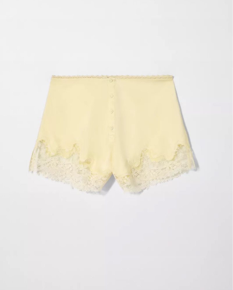 Yellow satin shorts with lace trim