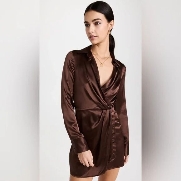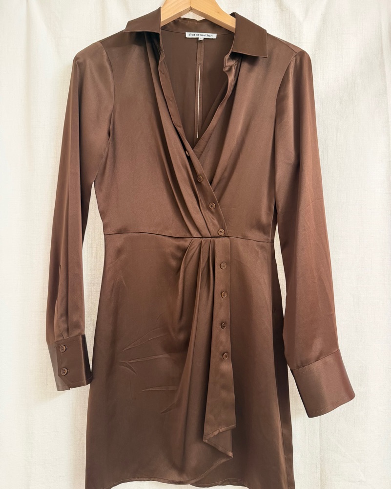 Reformation Alaine silk dress in chocolate brown. Wrap front, collared neckline, self-tie waist — incredibly chic and flattering.