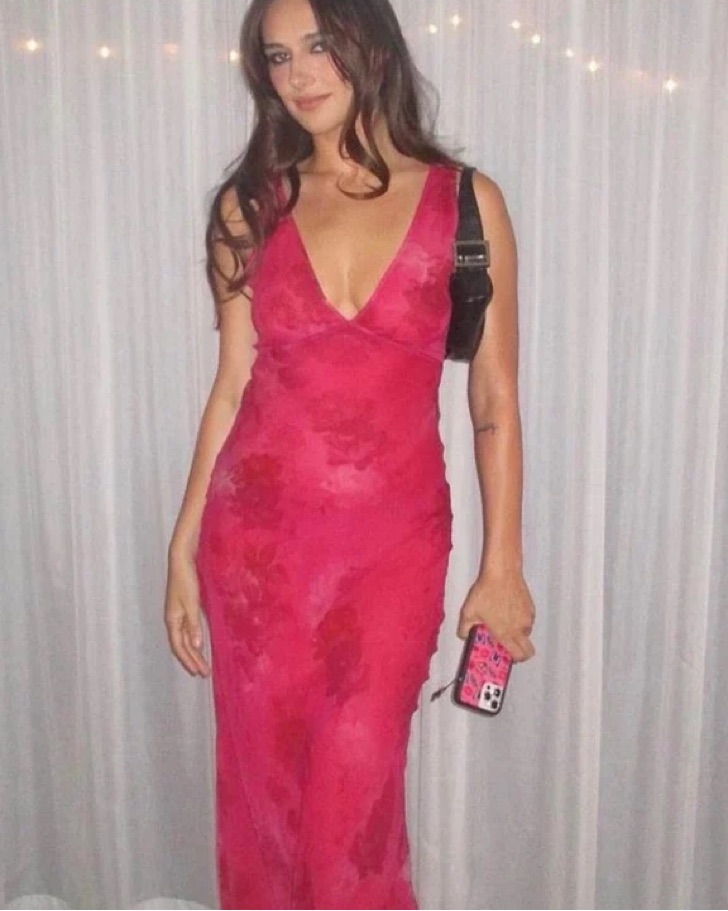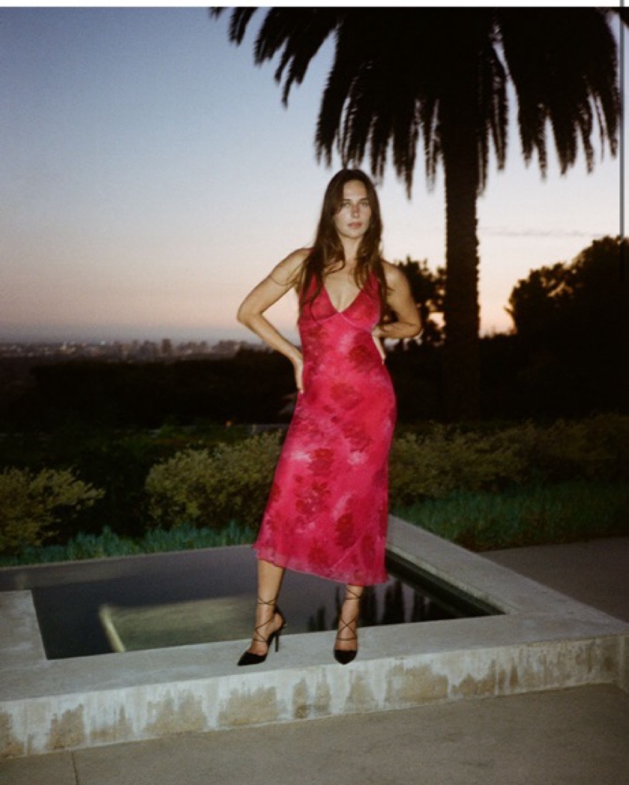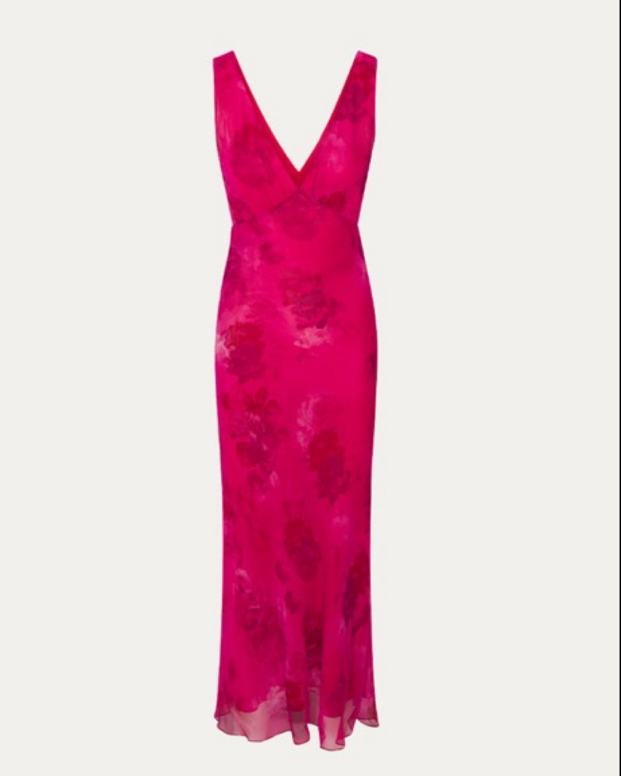 The marie dress in anastasia rose. Pure silk, with a contrast black tie at the back to pull you in at the waist, straps just wide enough to conceal your bra and the perfect deep V-neckline