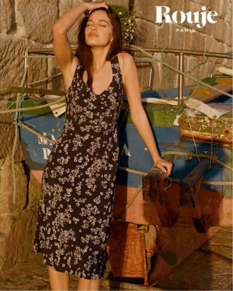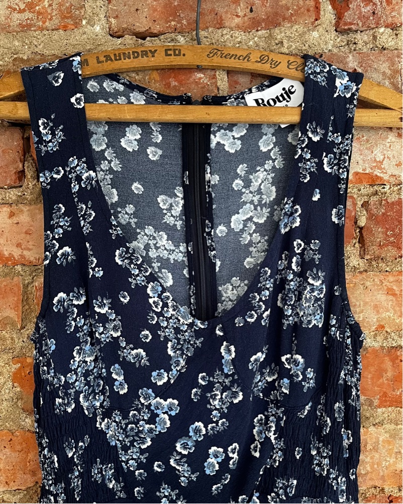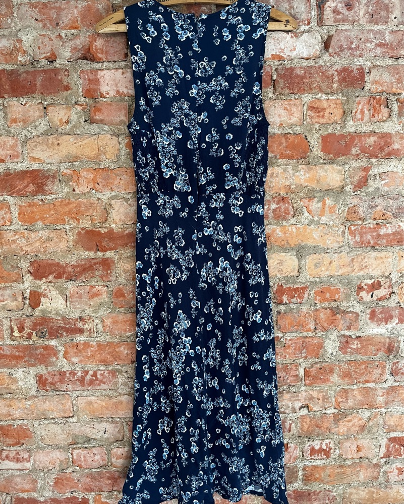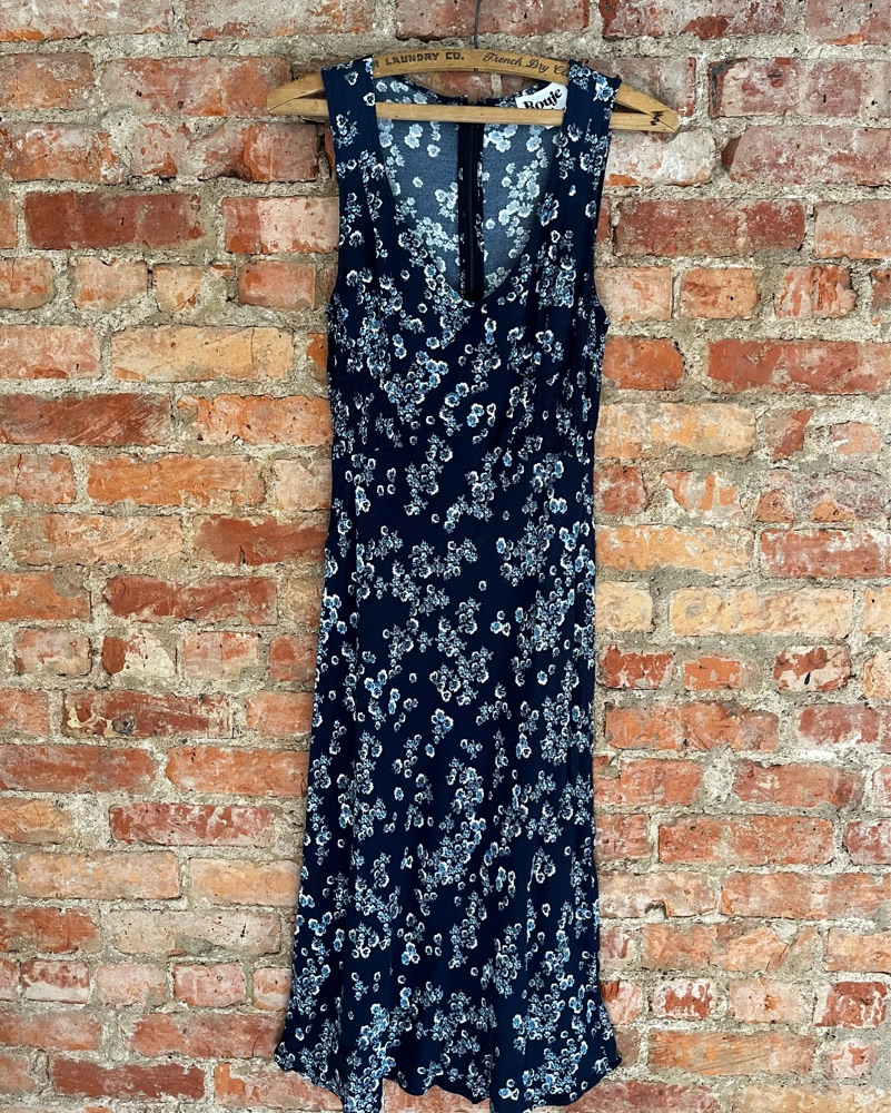 Rouje Paris Paulina dress in navy floral. Size French 38 / US 6. Excellent condition, no flaws, some wash wear on fabric. Fully lined, back zip. Midi length.
