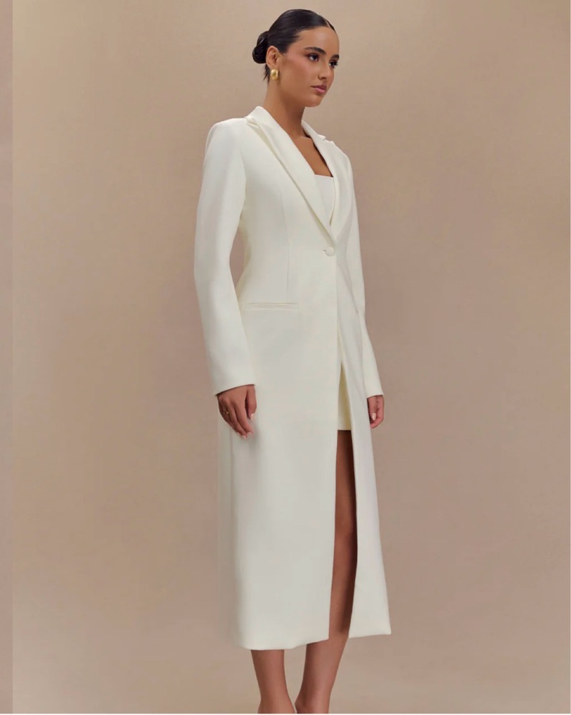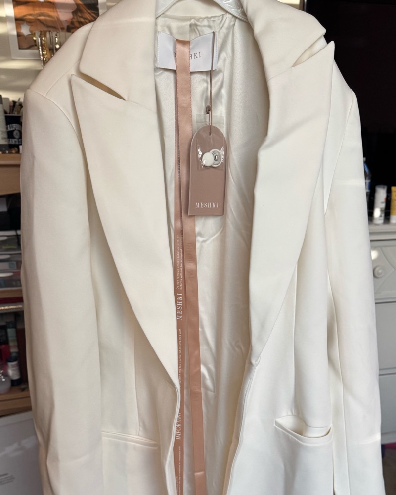 Never worn, sophisticated “CAVIAR Suiting Coat, a perfect fusion of timeless style and modern tailoring. The collared neckline and structured shoulder pads create a sharp silhouette, while the single button front closure keeps the look sleek and refined.“ Size sold out online!