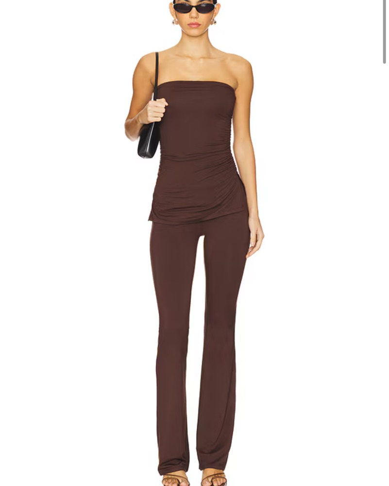 This stylish brown set is perfect for a night out on the town. The ruched detailing adds a flattering touch, while the slim fit and flared legs create a sleek, sophisticated look.