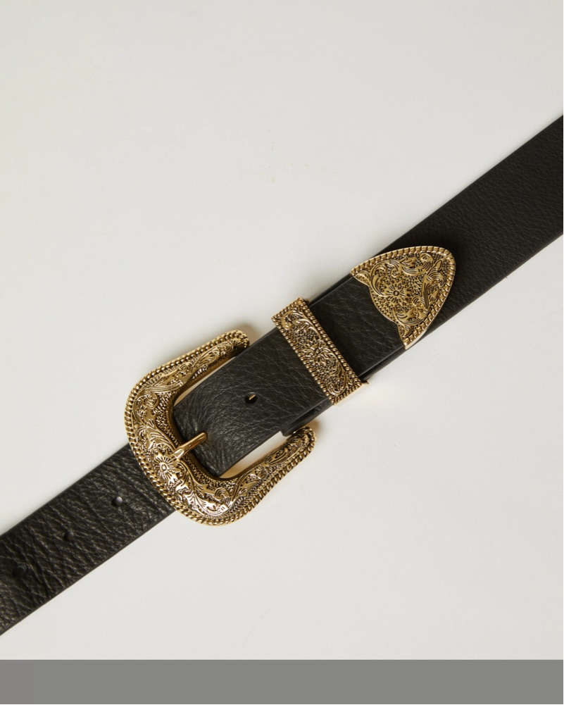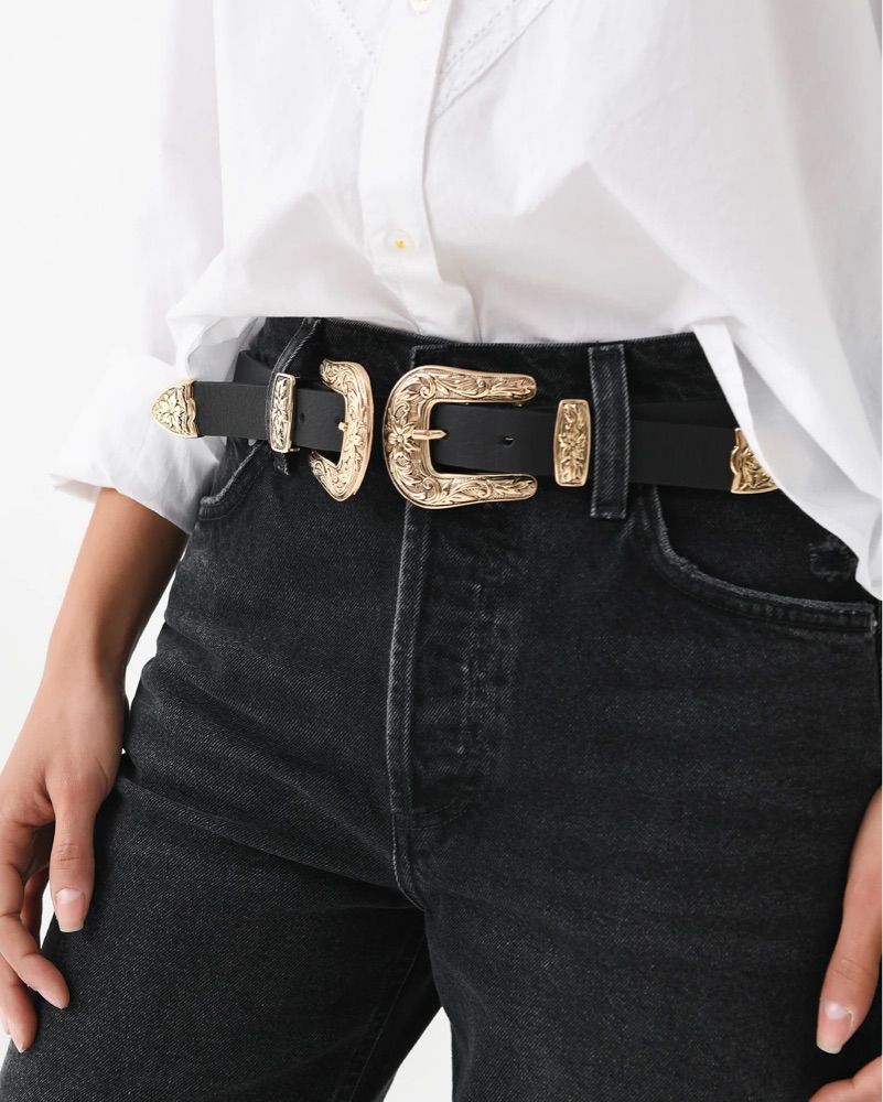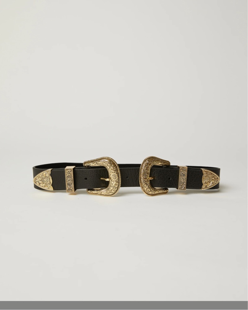 B-low the belt signature western style, the iconic Bri Bri belt. This western-inspired design incorporates a supple leather strap and detailed double buckles. Designed to be worn around the waist.