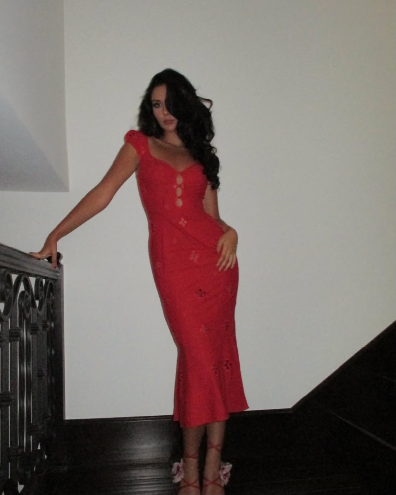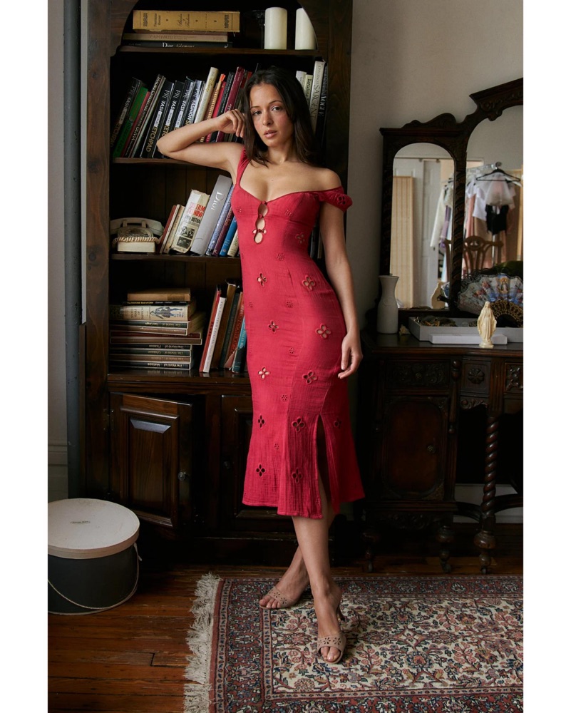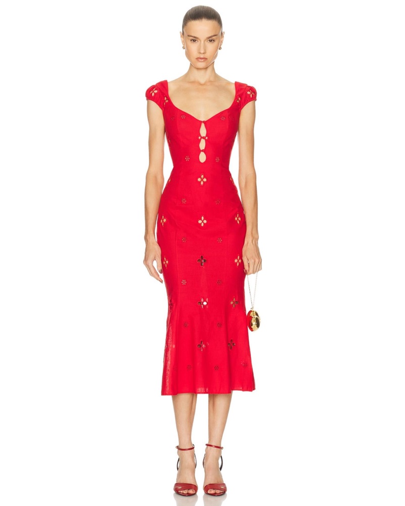 Maria Dress in Morango. Size small - true to size. Model is wearing this size. Tags: red dress, vacation dress, mirror Palais dress, valentines day dress. pink valentines dress. pink dress. red dress. valentines date night.