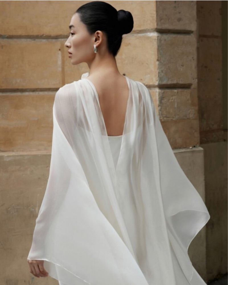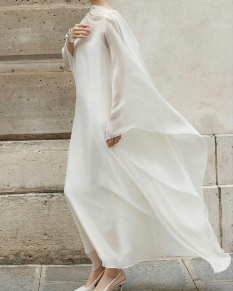 This stunning white dress features a flowing, draped design that creates a romantic, ethereal silhouette. Perfect for a special occasion or formal event. Beautiful getting ready dress for bride.