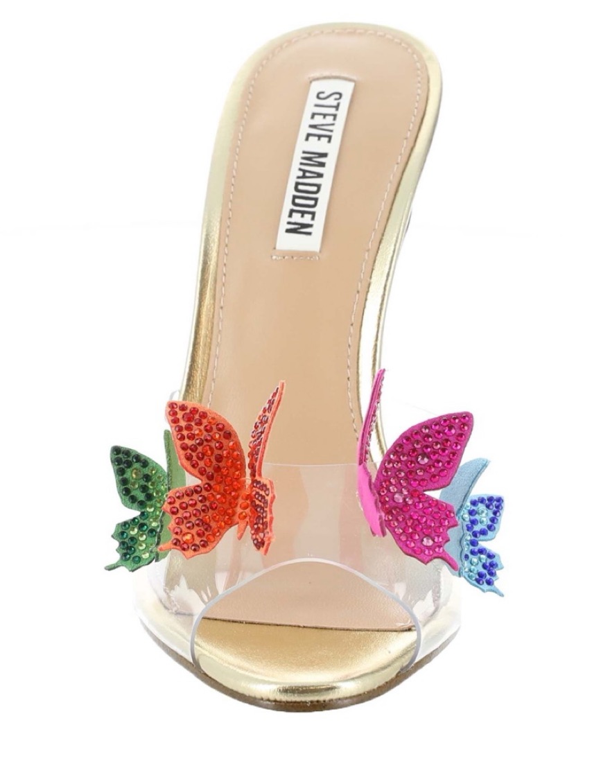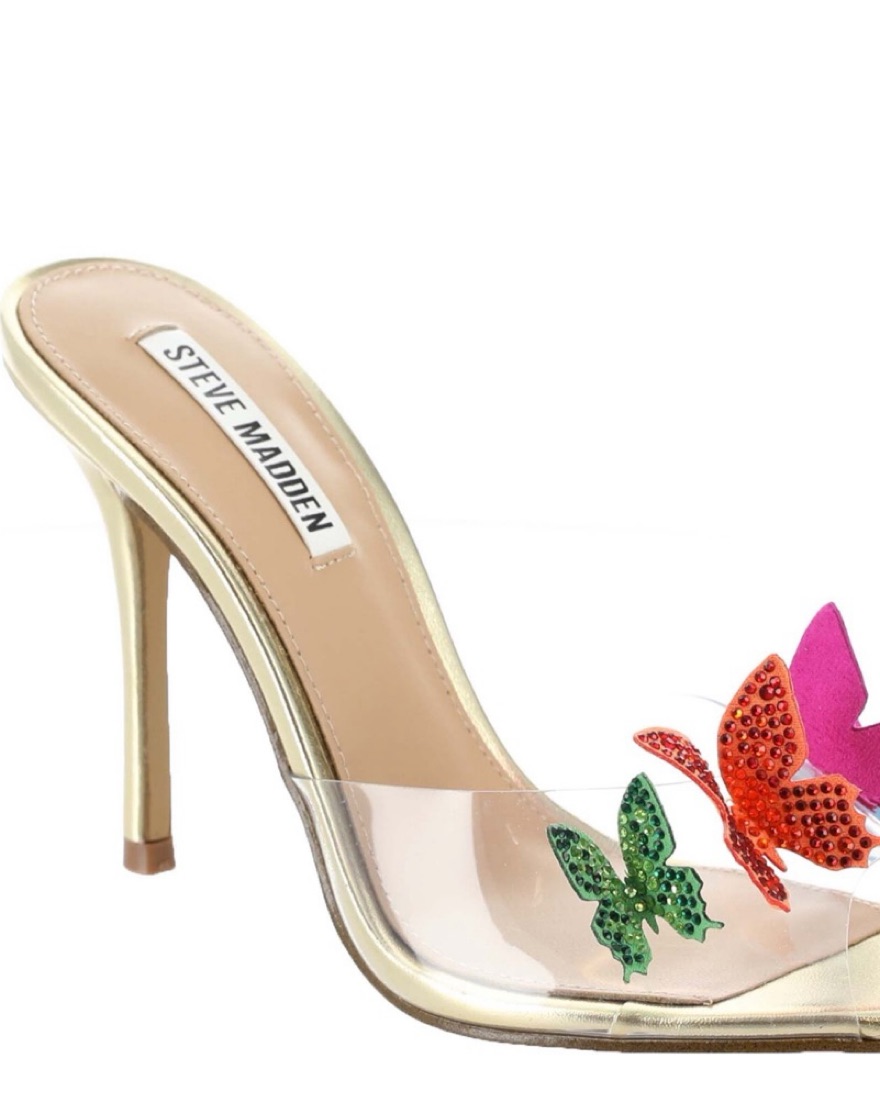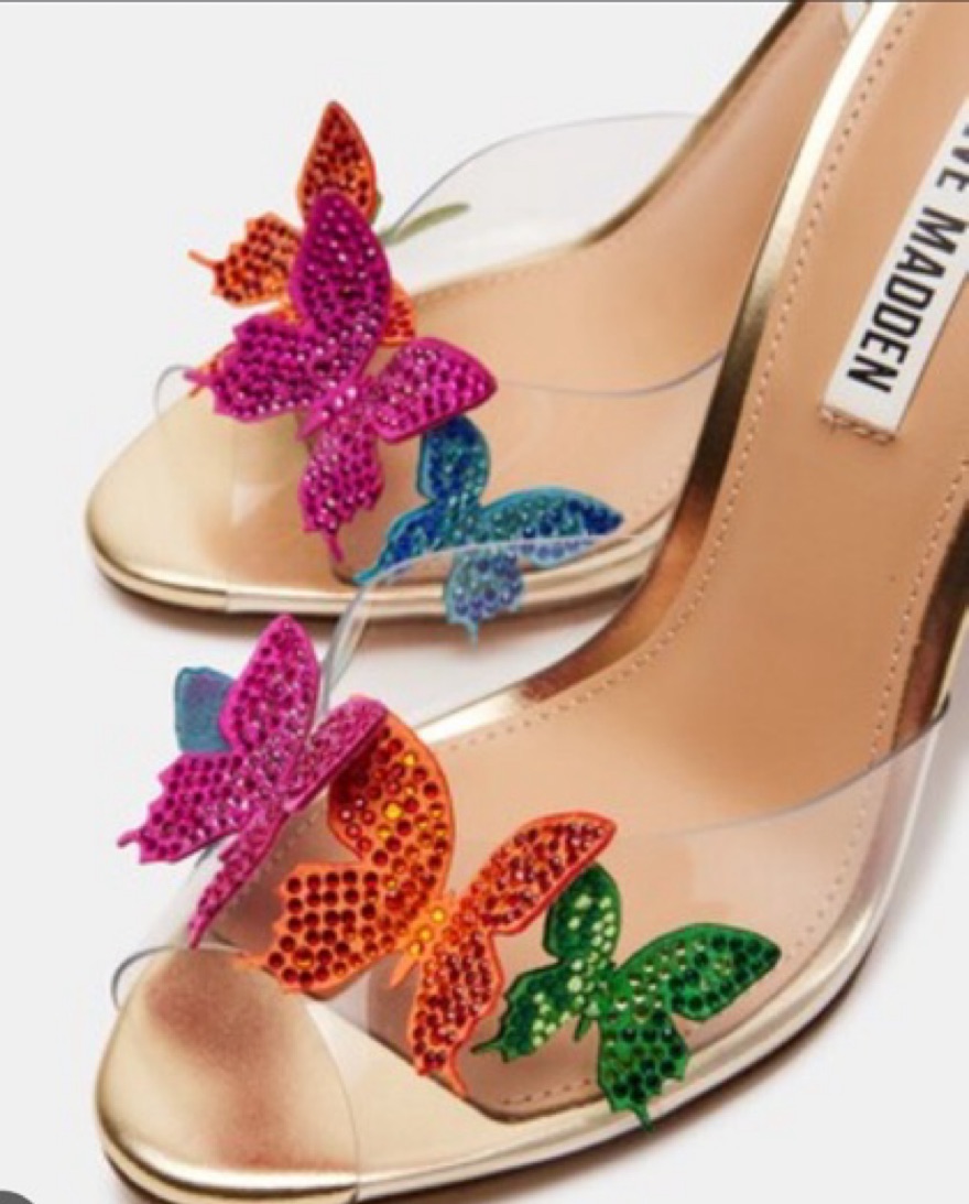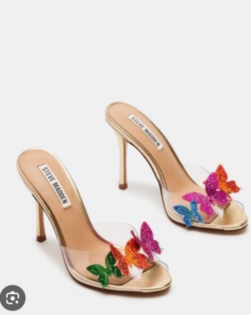 These high-heel stilettos are the perfect statement piece for a glamorous night out. The vibrant butterfly embellishments add a touch of playful elegance.
