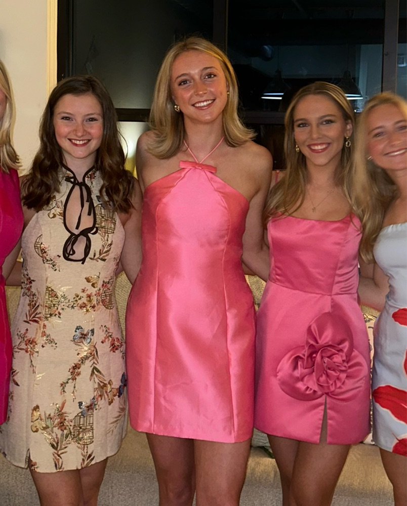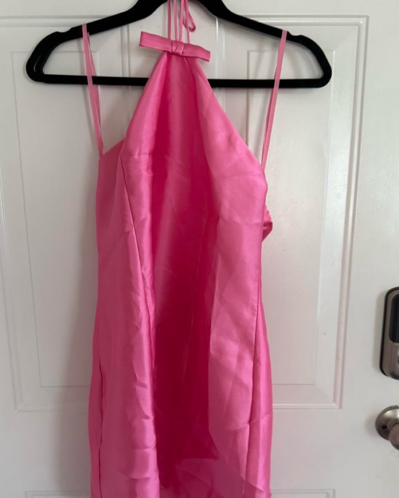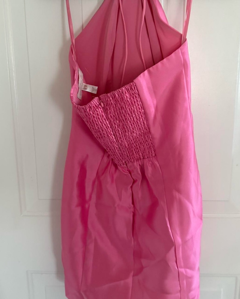 Pink Hutch cocktail dress from Anthro with tie back detail. Bought as a size small for $190 but found that it was still too big so I had the frame altered. I still think it fits like a small because there is elastic detail on the back which makes it stretchy.