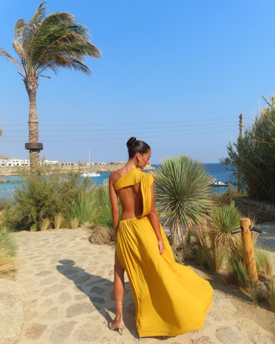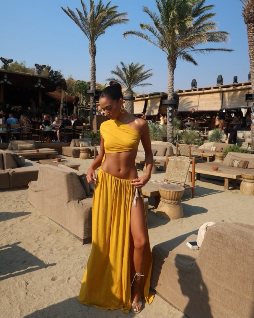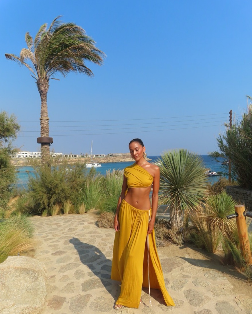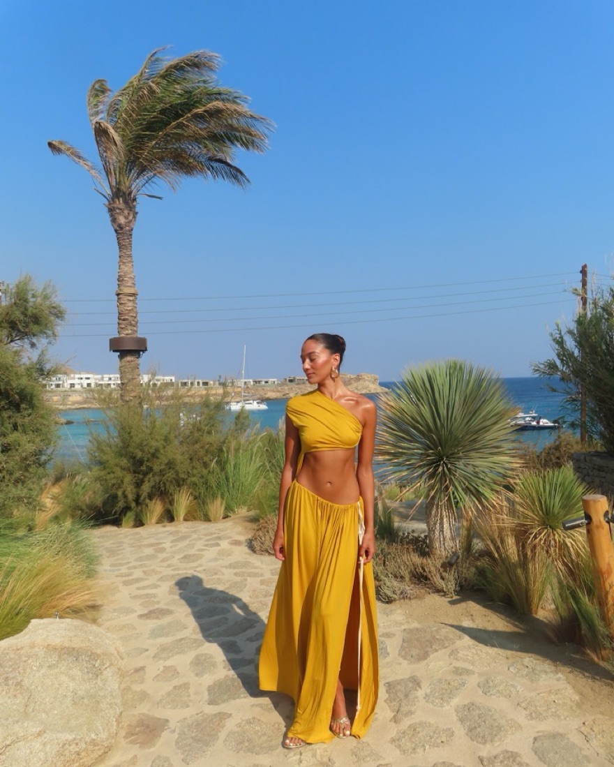 Maxi dress with illusion of being a two piece, in a soft fabric with stretch and hold.
