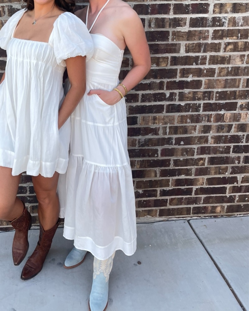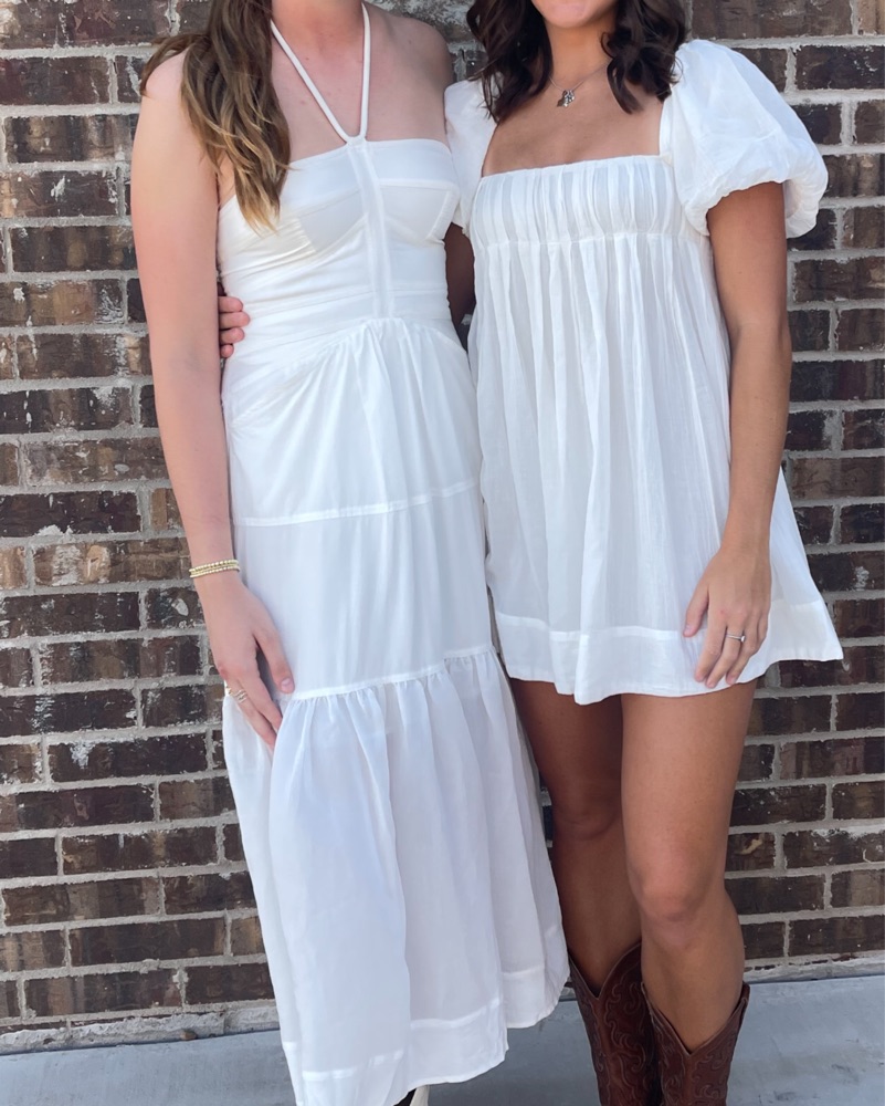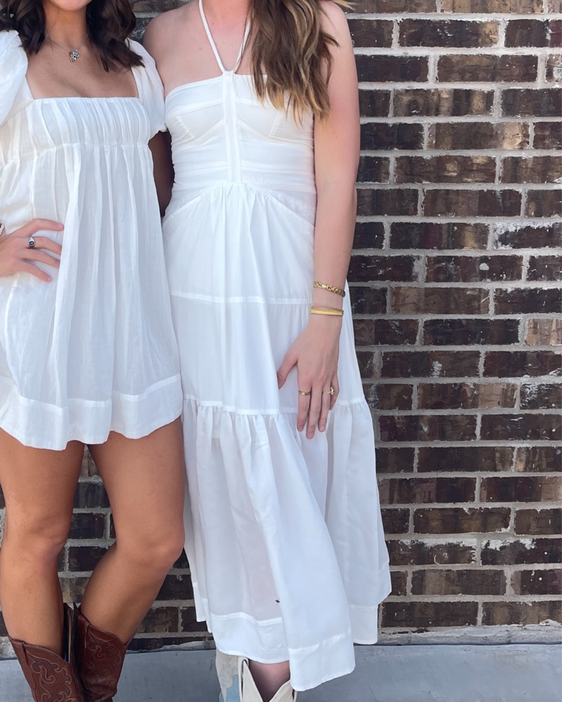 Long white maxi dress with halter neck tie. Perfect for a summer country concert
