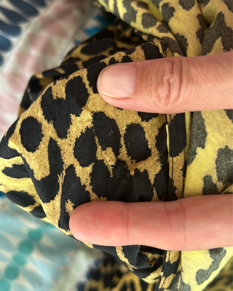 Wonderful Ganni cheetah print dress in 100% cotton popelin. The fit is superb but there is a small repair on the right sleeve (see pic), hence the very low price. The print is so busy that is honestly hard to see at all. Official size is a Danish 38