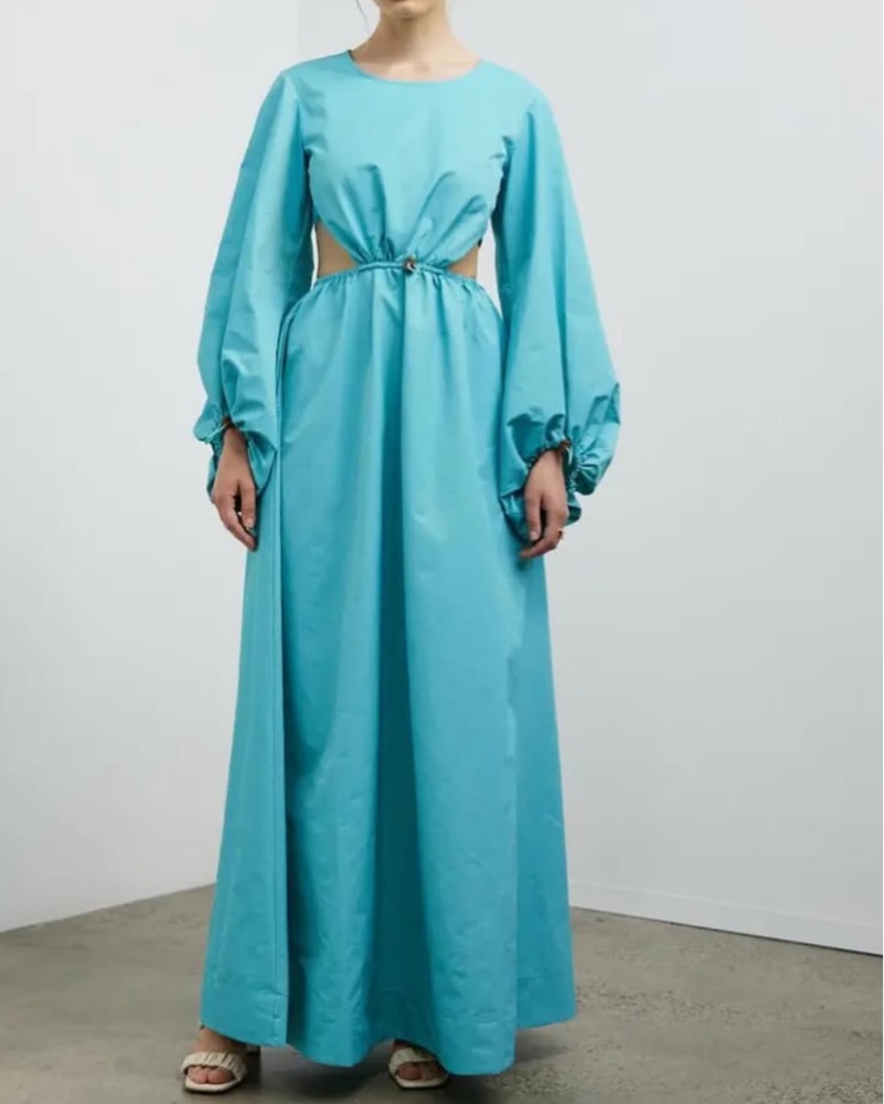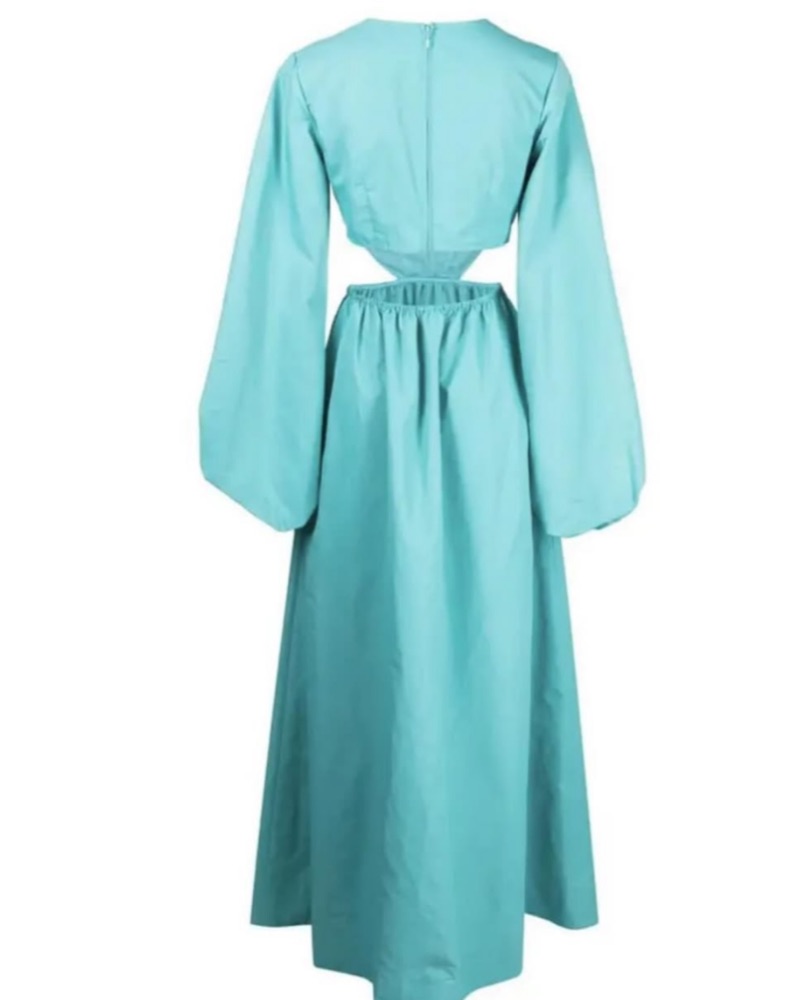 This stunning mint green maxi dress features a high-low hemline and voluminous bishop sleeves for a chic and sophisticated look. Perfect for a formal event or special occasion.