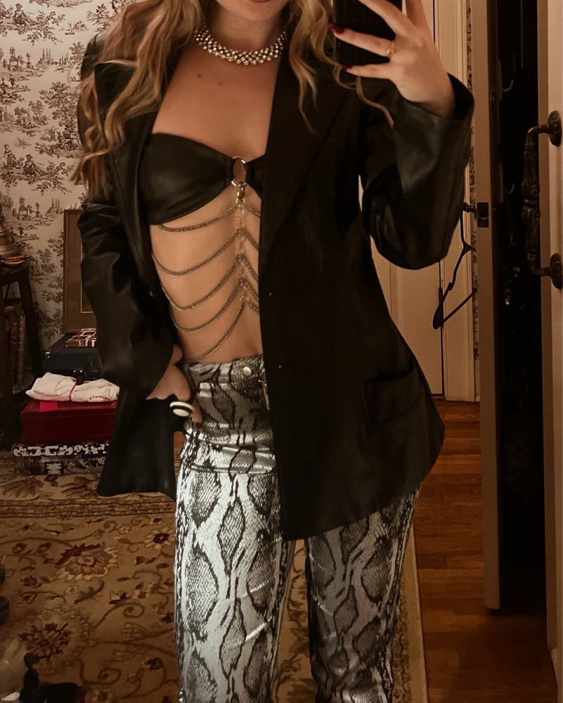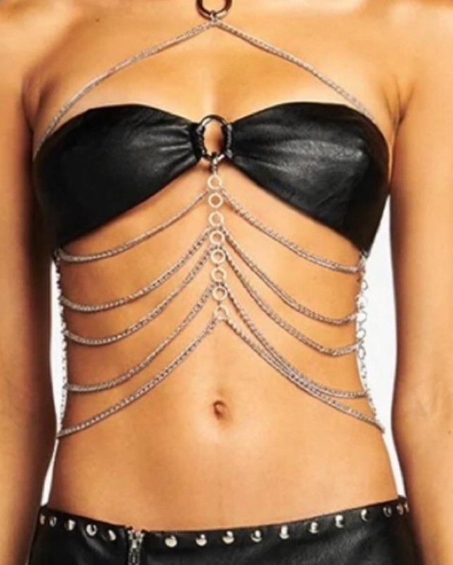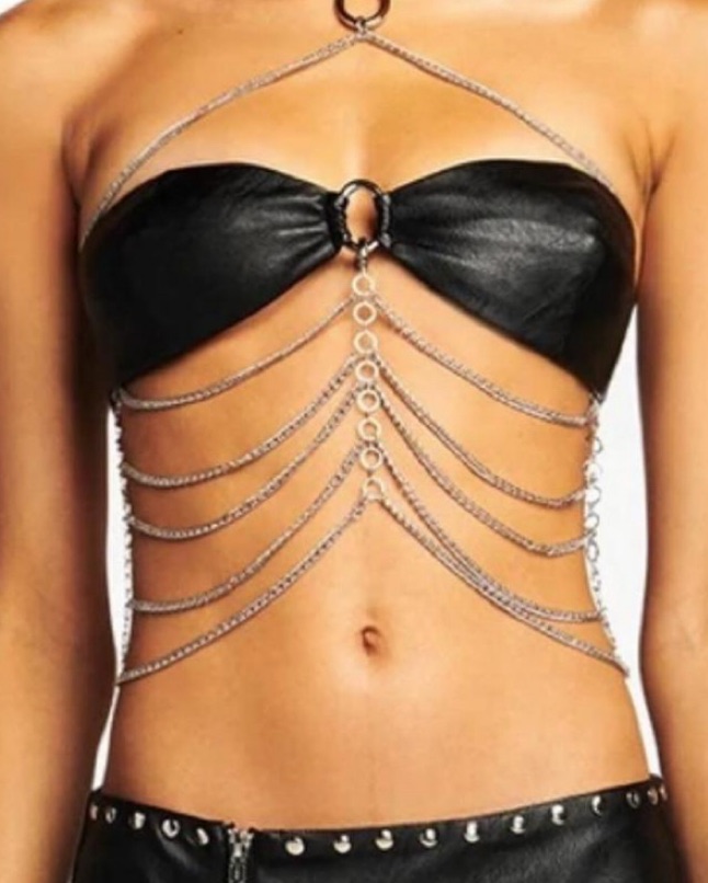 Size small. Black leather bandeau top with silver ring and chains. Perfect for going out, concerts, or raves. Size small.