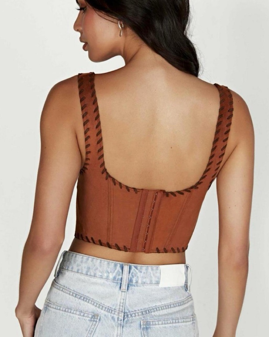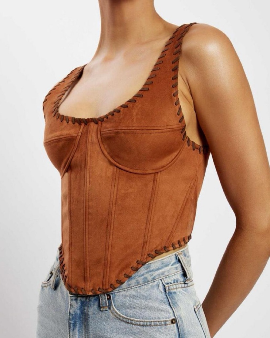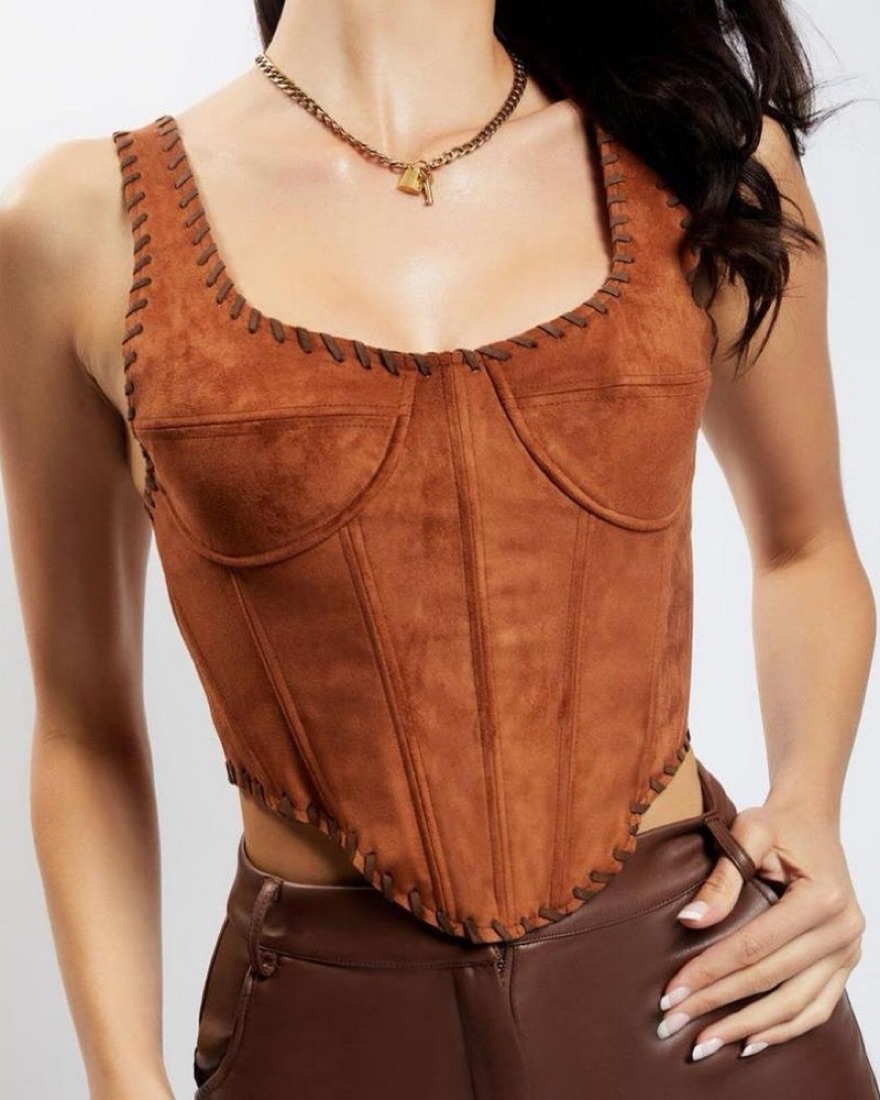 Brown and tan suede corset. Hook inclosure in back to adjust size. Form-fitting with room to breathe in chest.
