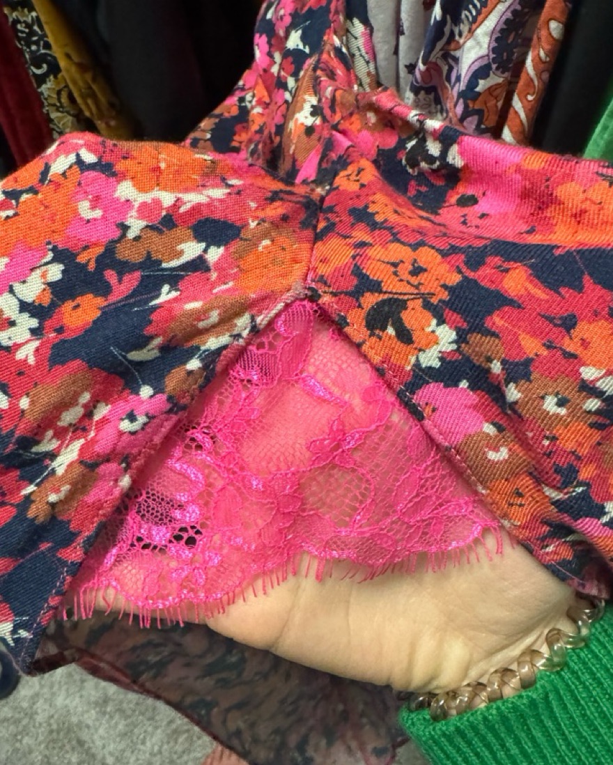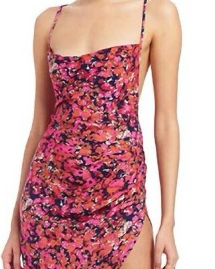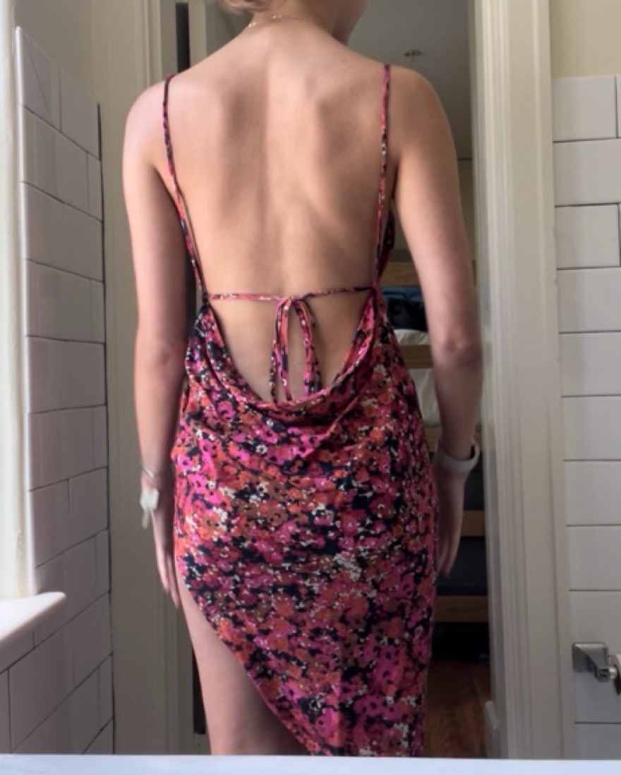 Adorable floral dress with high slit, cowl neck, and tie back. Back is the best part!!! So flattering. I had a piece of pink lace sewn in so the slit wouldn’t be so high (see last pics). Fits size S. Perf for a formal or night out!
