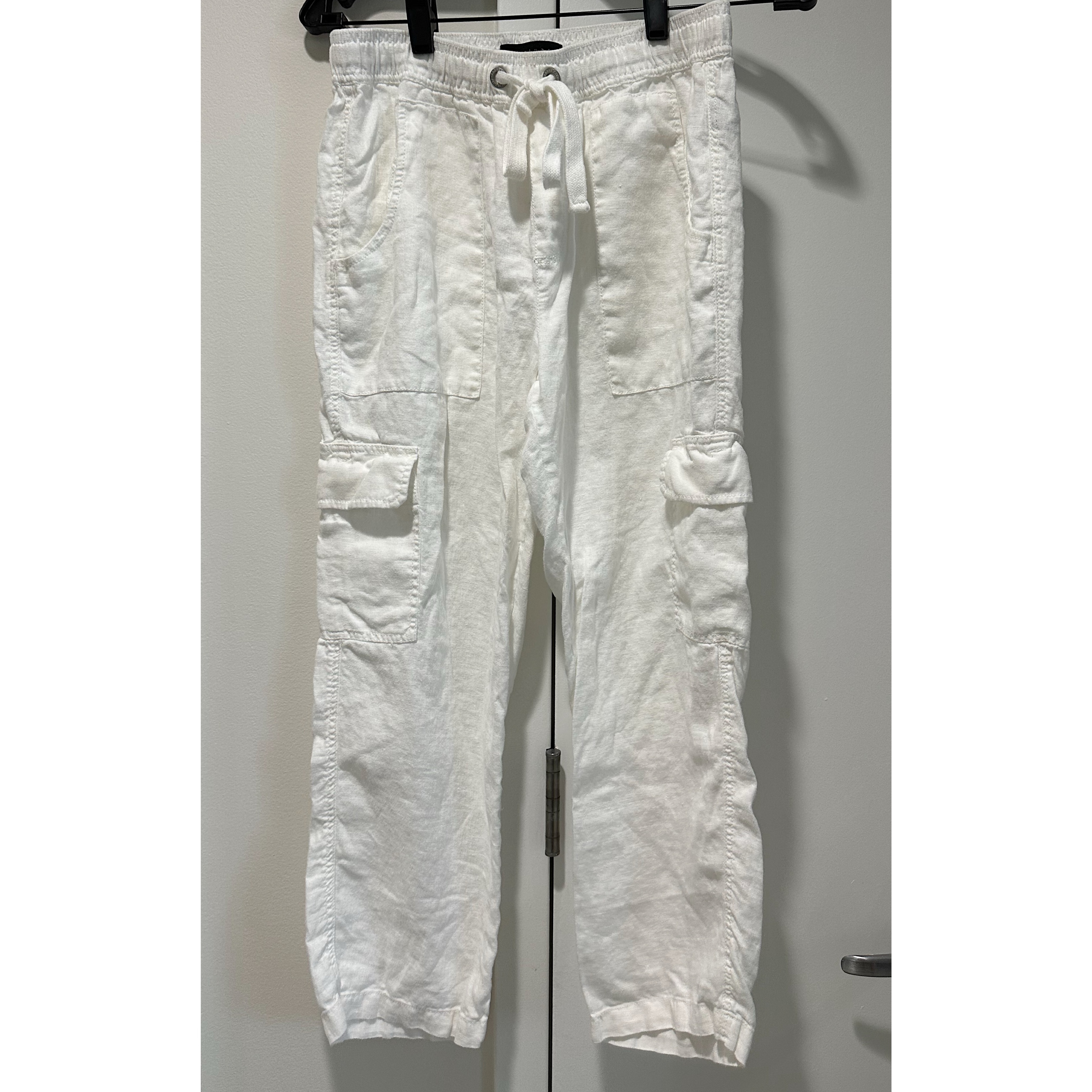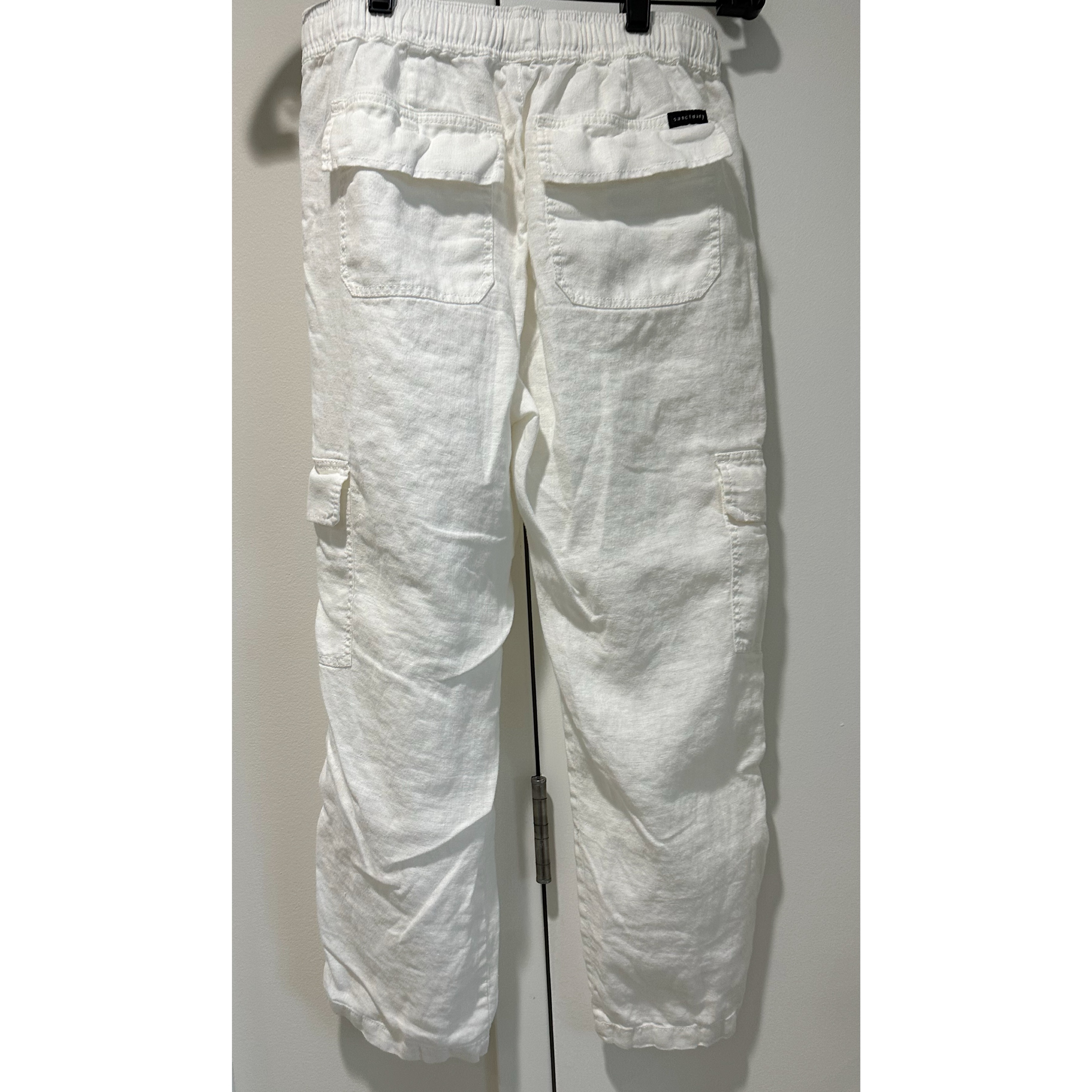 White Linen blend pants. Hand wash cold. Elasticized drawstring waist. Side slant pockets. Side cargo pockets. Back flap pockets with button closures. 16" at the knee narrows to 14" at the leg opening.