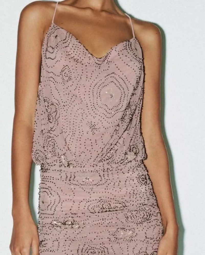 This captivating sequin slip dress is perfect for a night out. The intricate pattern and shimmering details add an elegant touch, making it ideal for special occasions.
