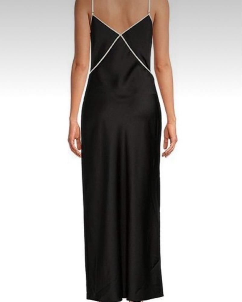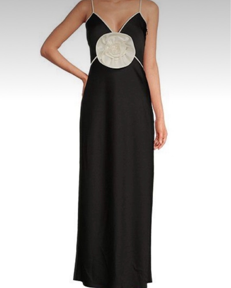 This sleek black midi dress is perfect for a formal event or special occasion. The delicate white floral accent adds a touch of femininity and elegance. Only worn once!