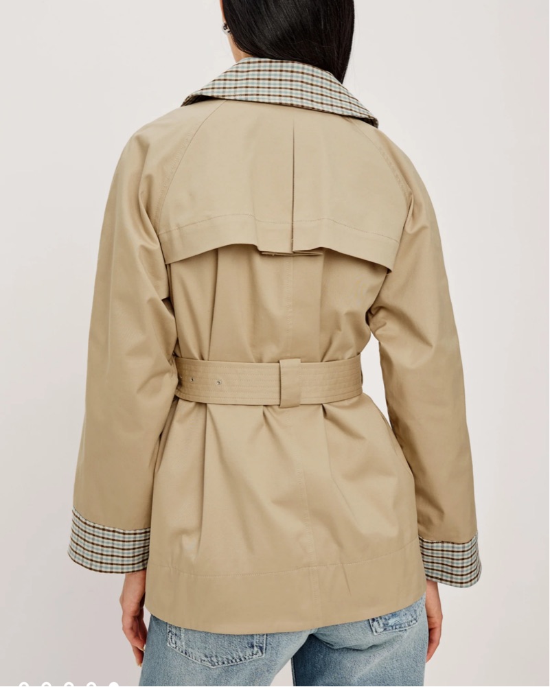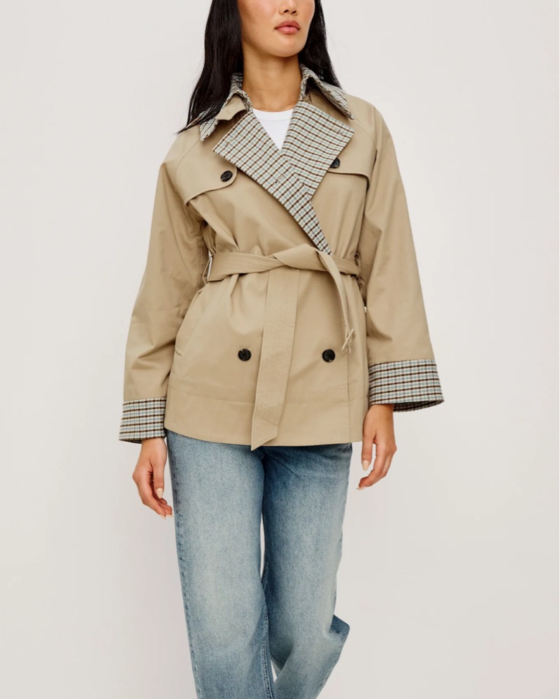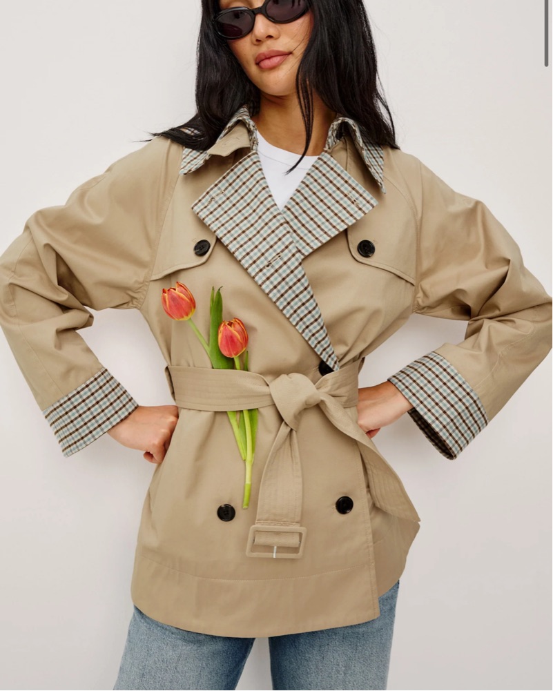 A perfectly proportioned trench, the Lucien is crafted from soft water-resistant garbardine and features a contrast gingham collar and cuffs, double-breasted buttons, an adjustable waist belt, side pockets, and a back vent.
