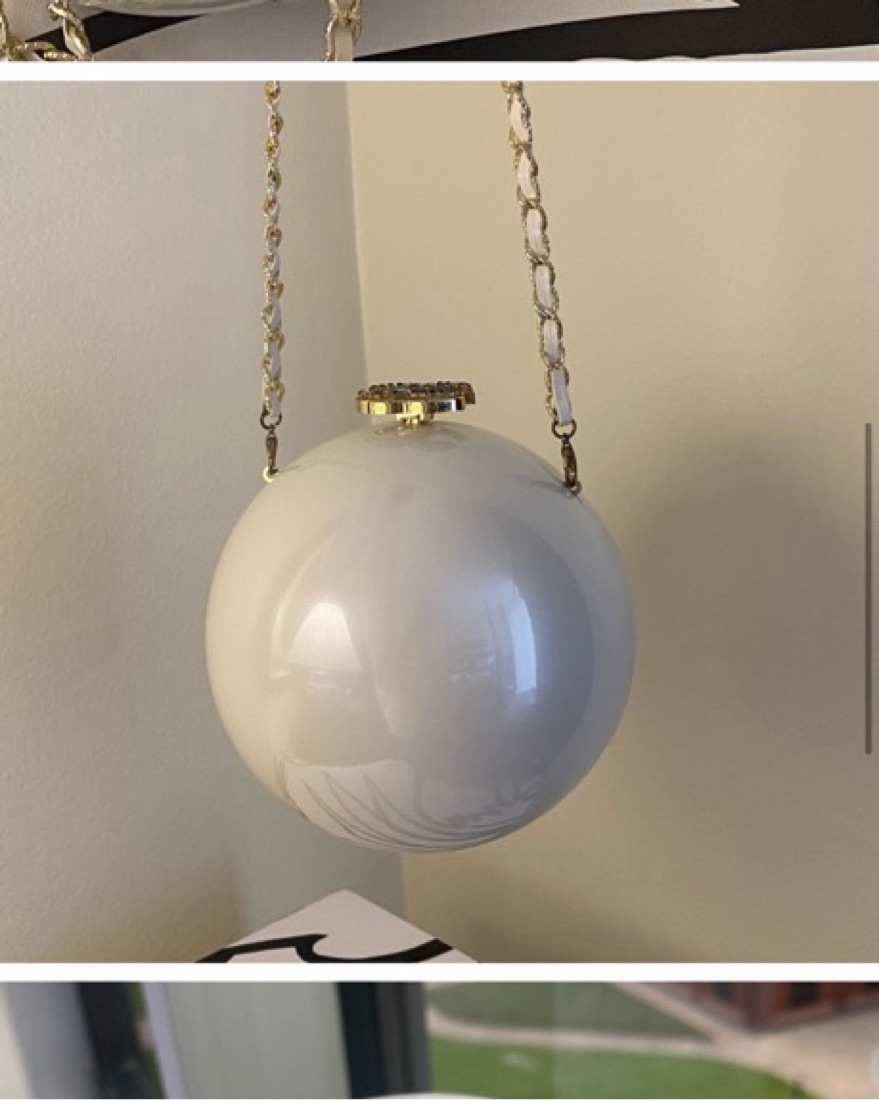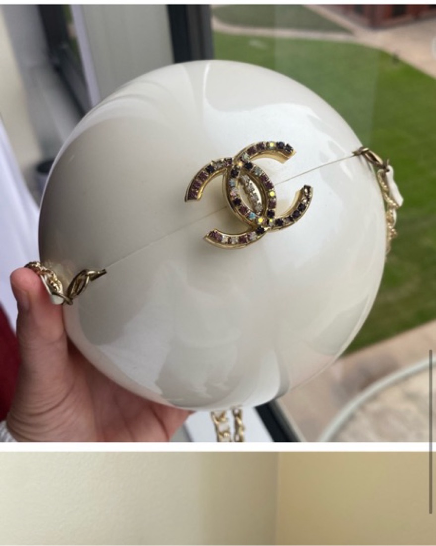 Iconic Chanel VIP gift Bag circular pearl acrylic with crystal CC opening and detachable chain strap.
