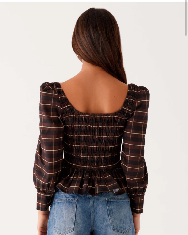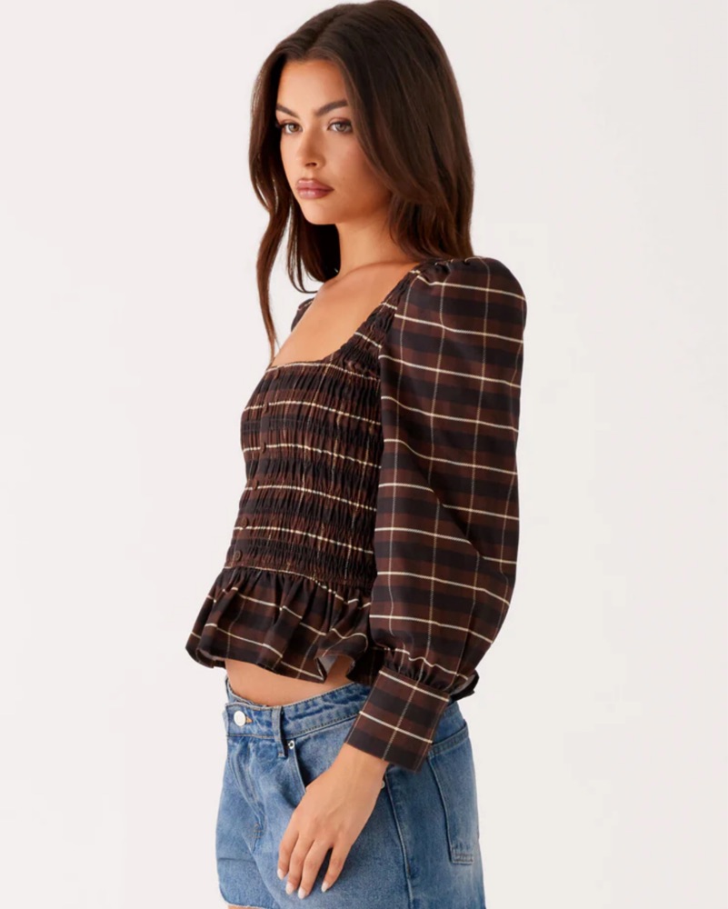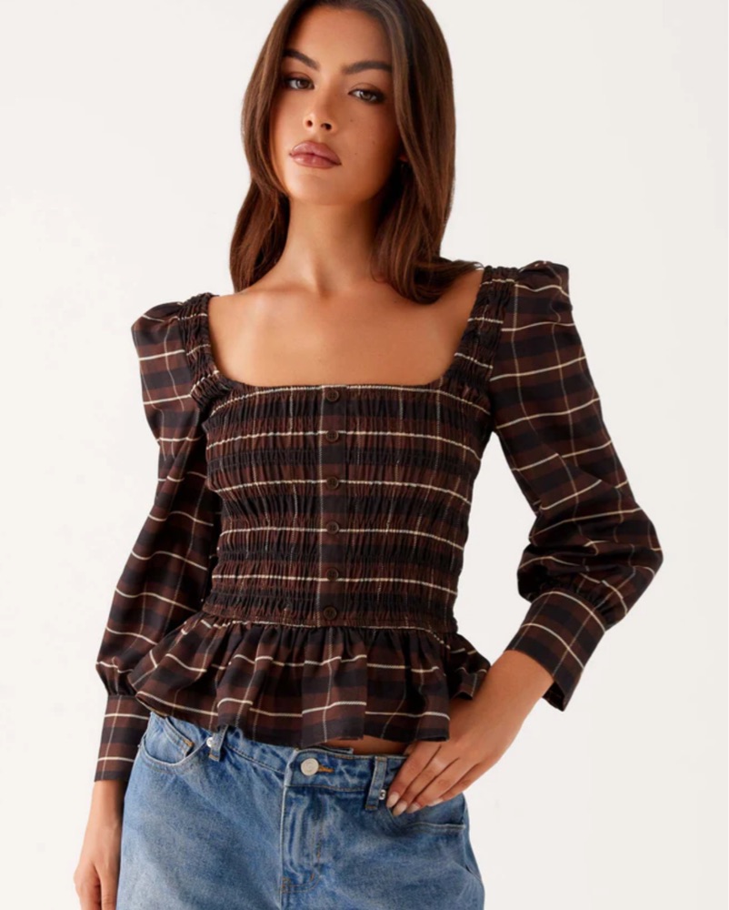 This trendy checkered top with puff sleeves is perfect for a chic and elevated daytime look. Pair it with your favorite high-waisted jeans for a casual-cool vibe.
