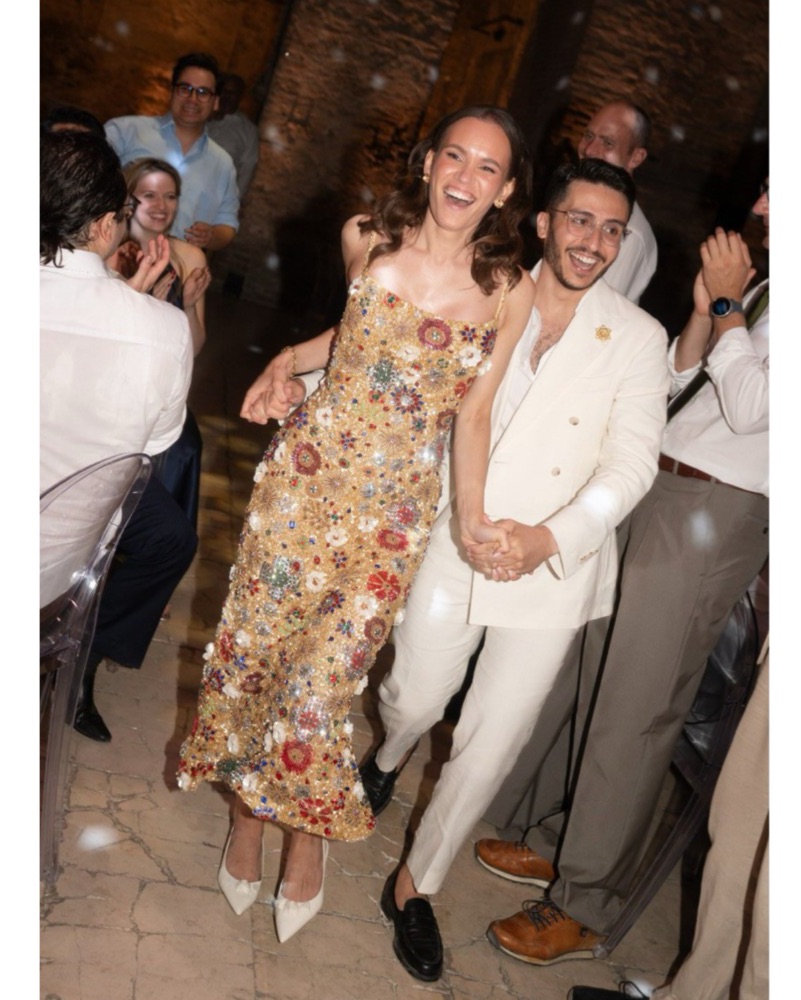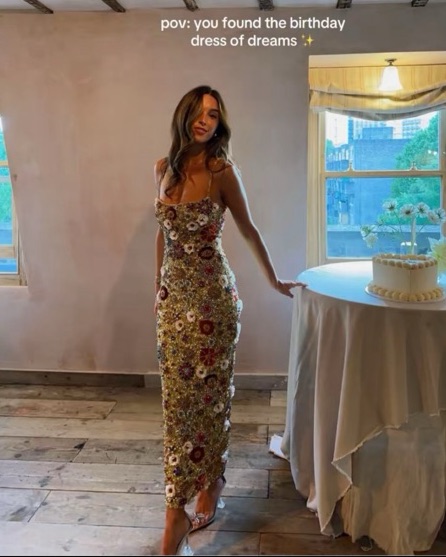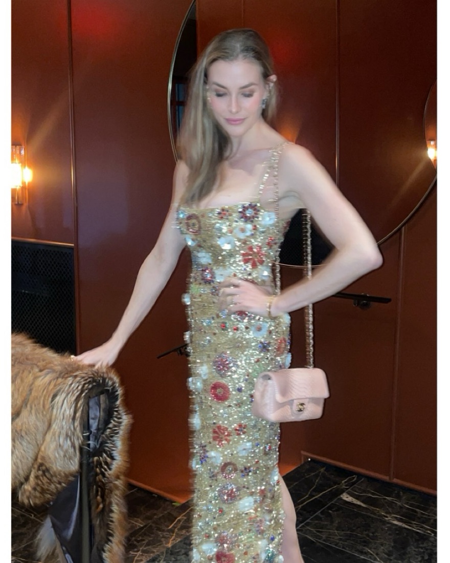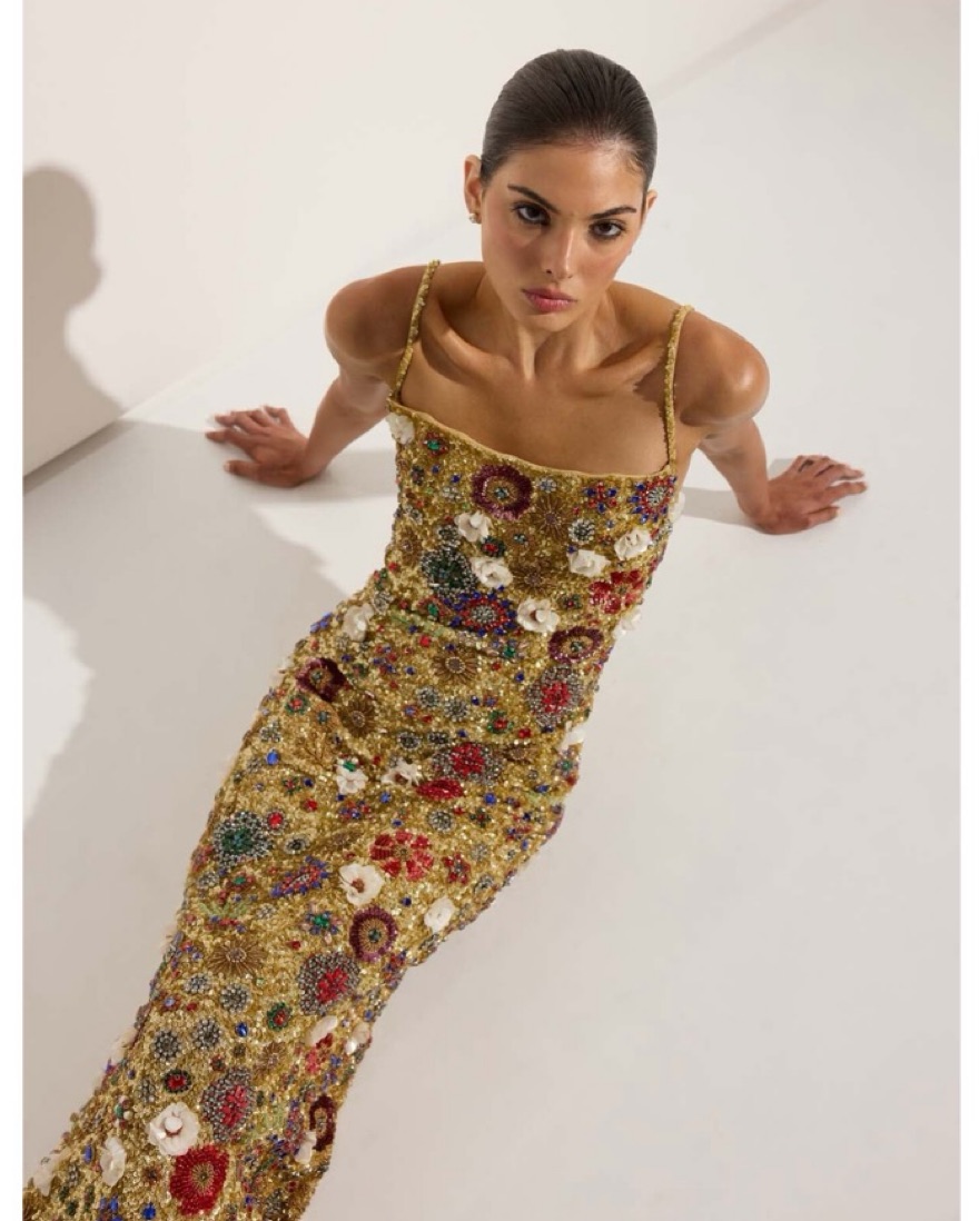 An all-glamour silhouette, saturated in signature Rachel Gilbert heavy beading cut to a figure flattering shape with dainty straps. An absolute showstopper of a dress. Very fragile—wear with care. Black-tie, event, glam, birthday dress, gold. Everyone’s fav wedding guest dress.
