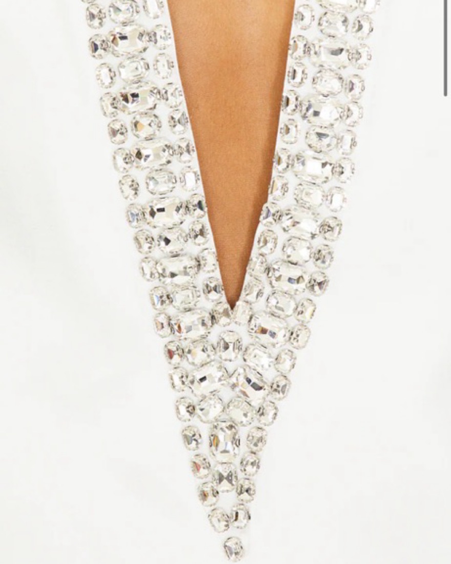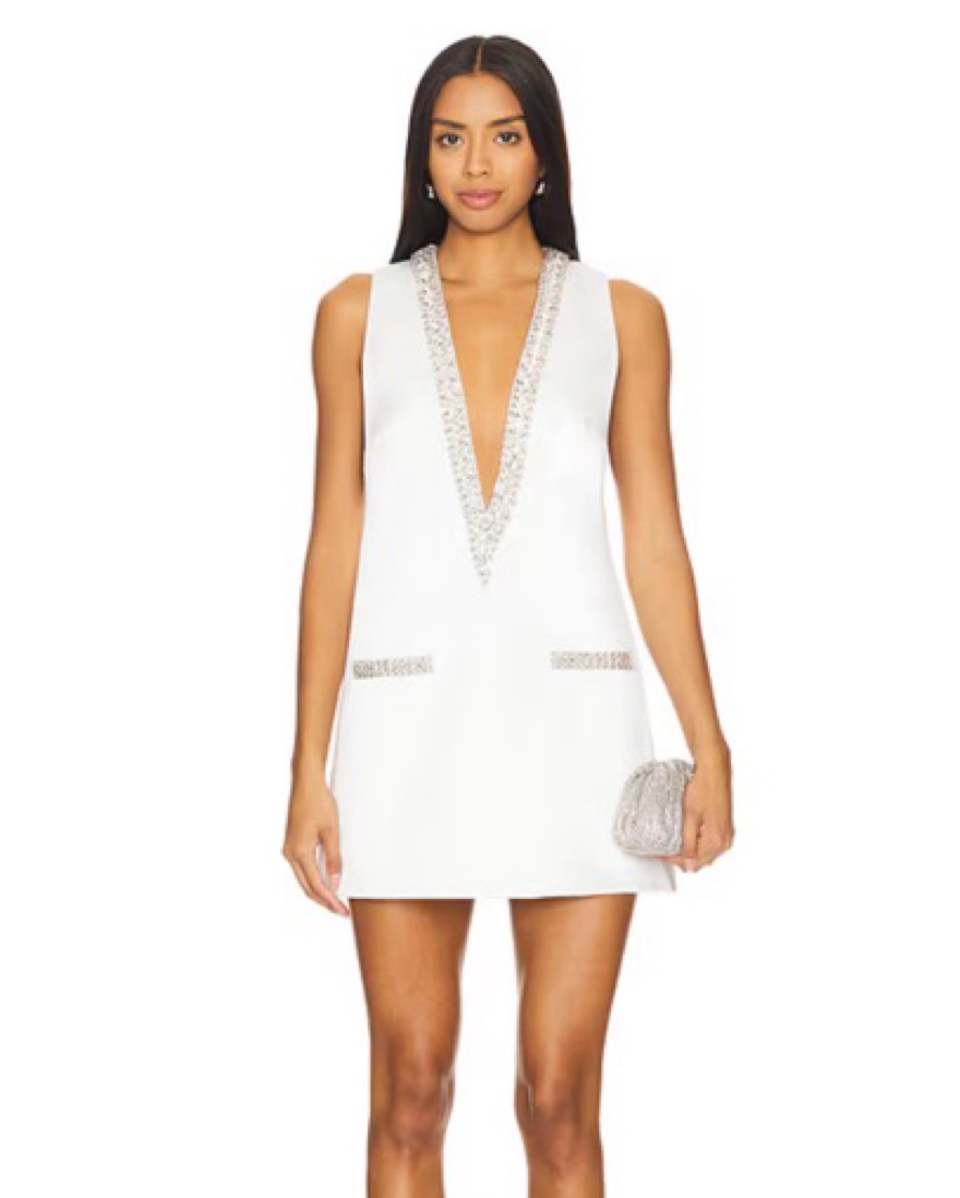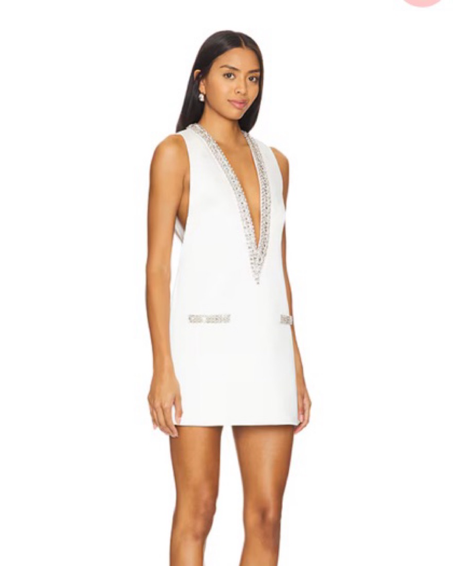Retrofete Nancie Dress in White- plunge mini dress with crystals. Perfect for bridal, white party, birthday, special occasion