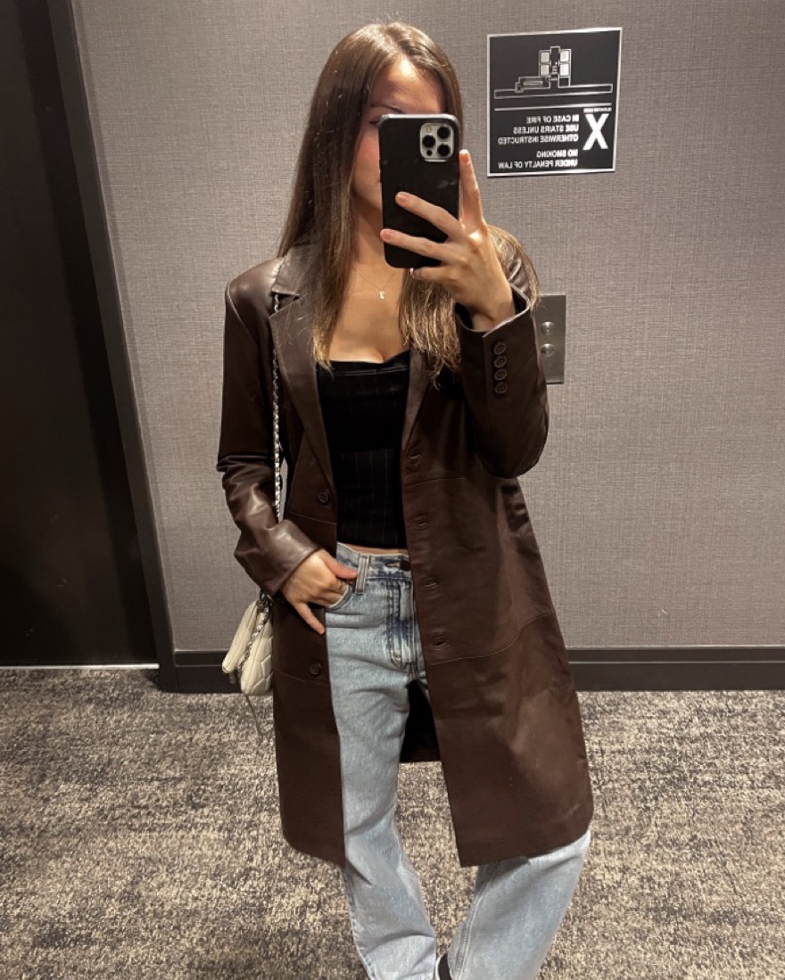 GORGEOUS brown leather coat. It is leather so fits TTS. such a stunning jacket perfect for fall! Please take care of her - one of my favorite pieces I own :) key words: fall, coat, jacket, leather trench