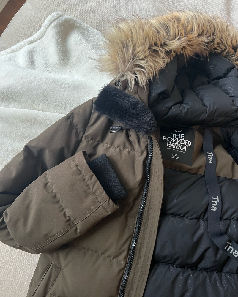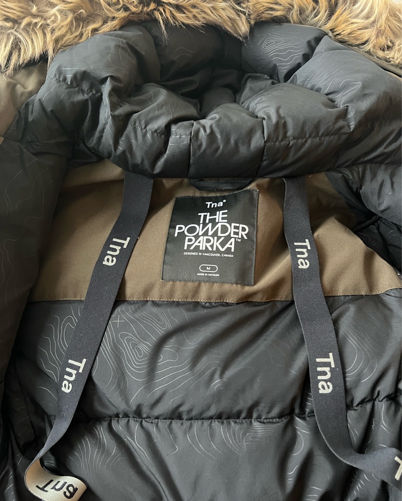 Like new condition Aritzia TnA The Powder Parka Dark Olive Green mid-length down jacket size M. Worn a handful of times, but no signs of wear. This jacket is incredibly warm and cozy! There’s a reason why it’s always sold out!