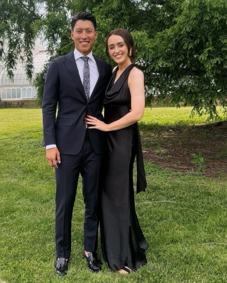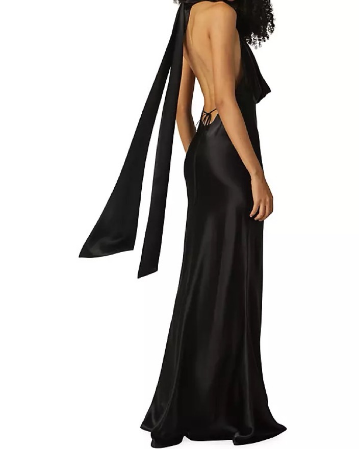 Crafted of smooth satin, Sau Lee's evening gown features a plunging cowl neck, fitted waist, and an alluring low open back.