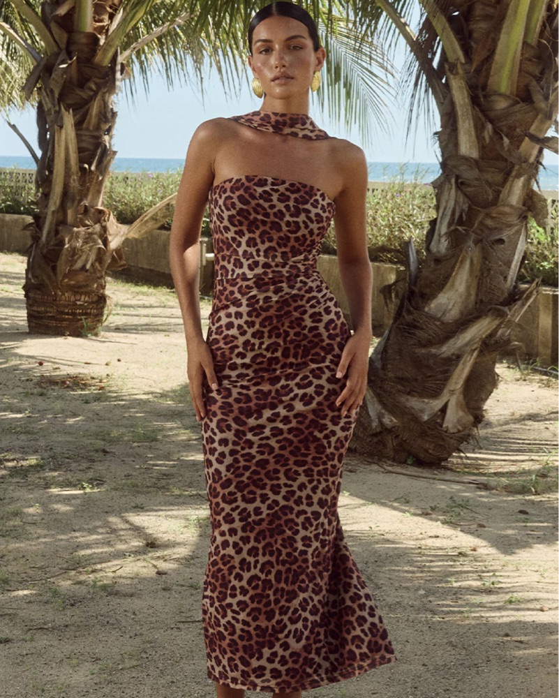 This stunning leopard print maxi dress is perfect for a night out or special occasion. The form-fitting silhouette and open back design create a glamorous look.