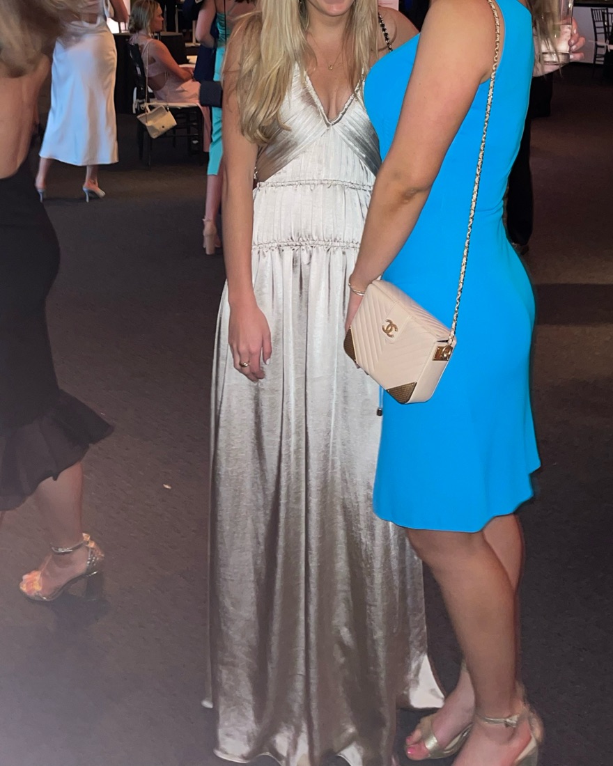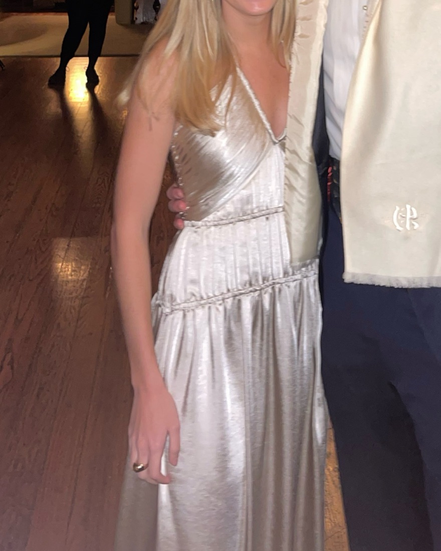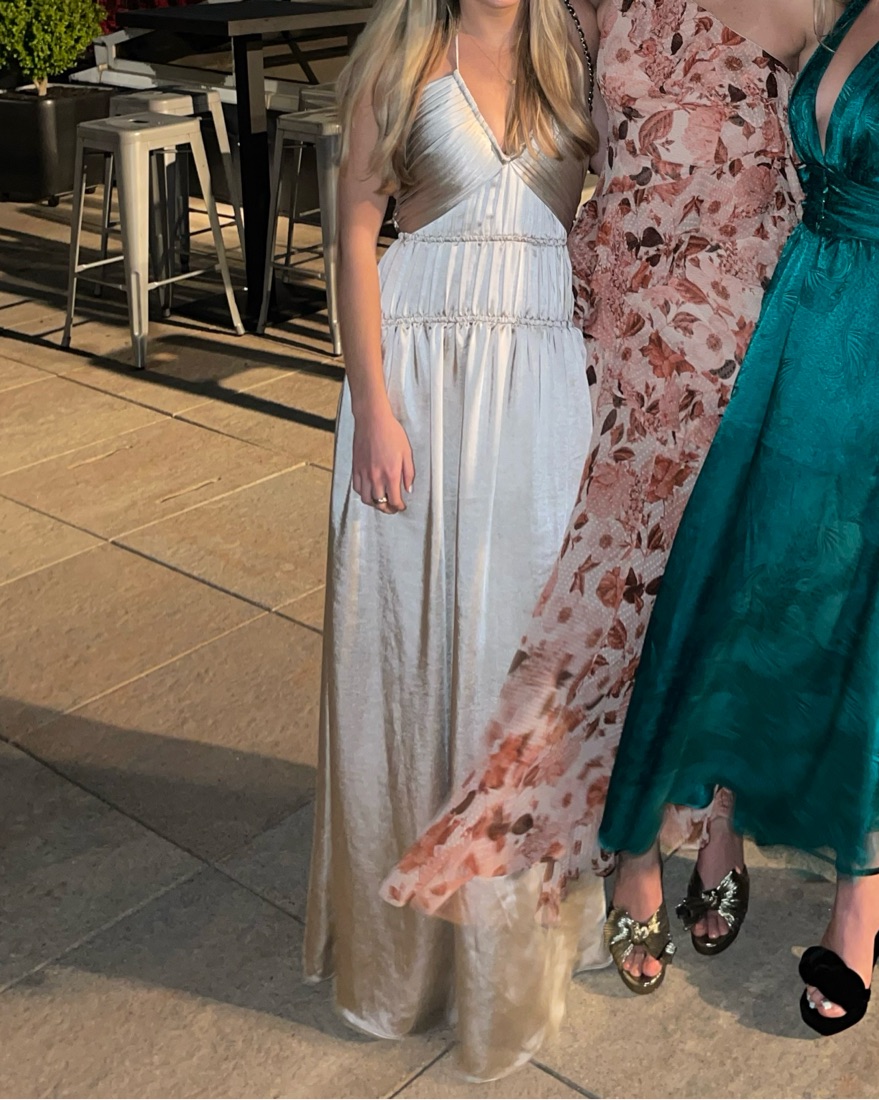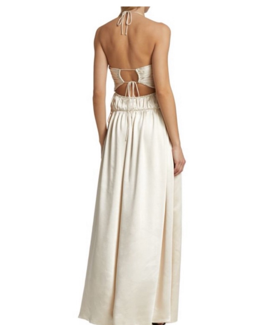 Stone Clementine halterneck gown from JONATHAN SIMKHAI featuring satin finish, ruched detailing, cut-out detailing, halterneck, rear tie fastening, sleeveless and long length. Light gold/ champagne color sheen. Perfect for a fall/ winter black tie wedding!